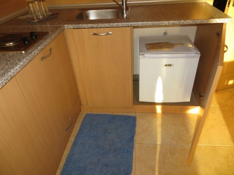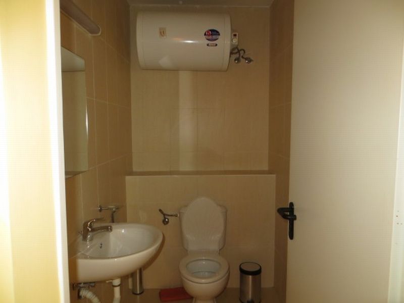 The total area is 80. 88 sq. m. Layout is the following: a living room with a kitchen and a toilet with the possibility of putting in a shower, a bedroom with a toilet and a tub and a huge terrace (about 10 sq. m.). There is the possibility of partitioning and building another small bedroom (thus it becomes a two-bedroom apartment). The apartments are offered for sale with the furniture from the pictures - kitchen furniture, two air conditioners, a bed, a dining table, furniture set, and so on.