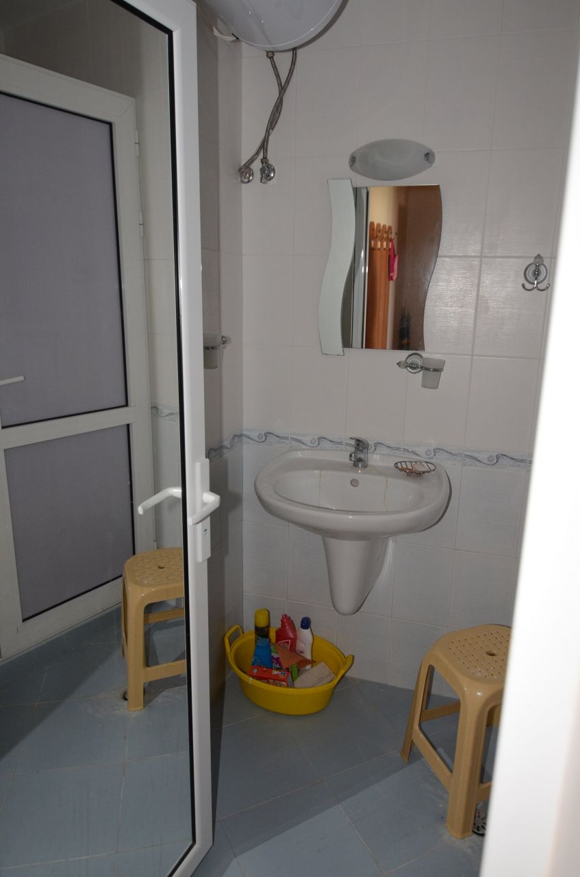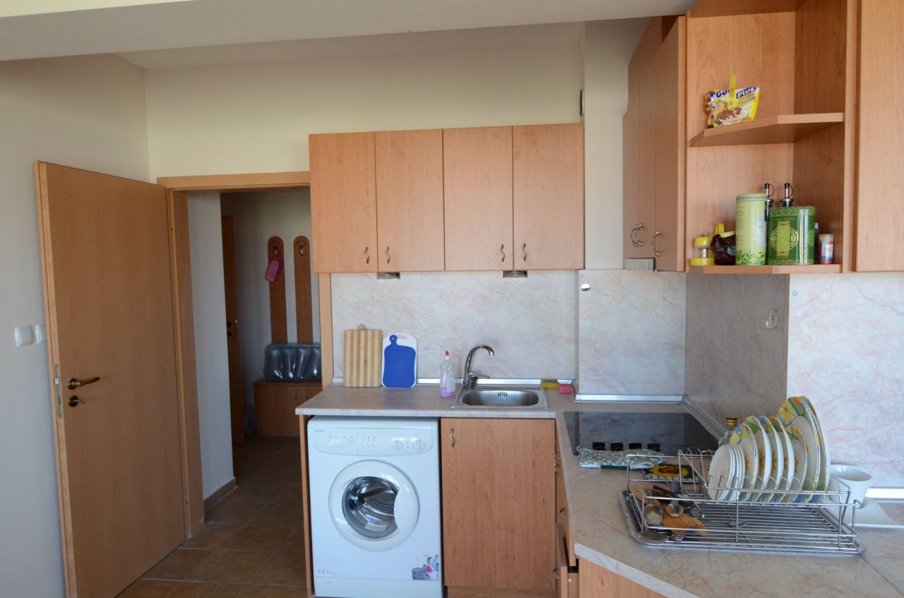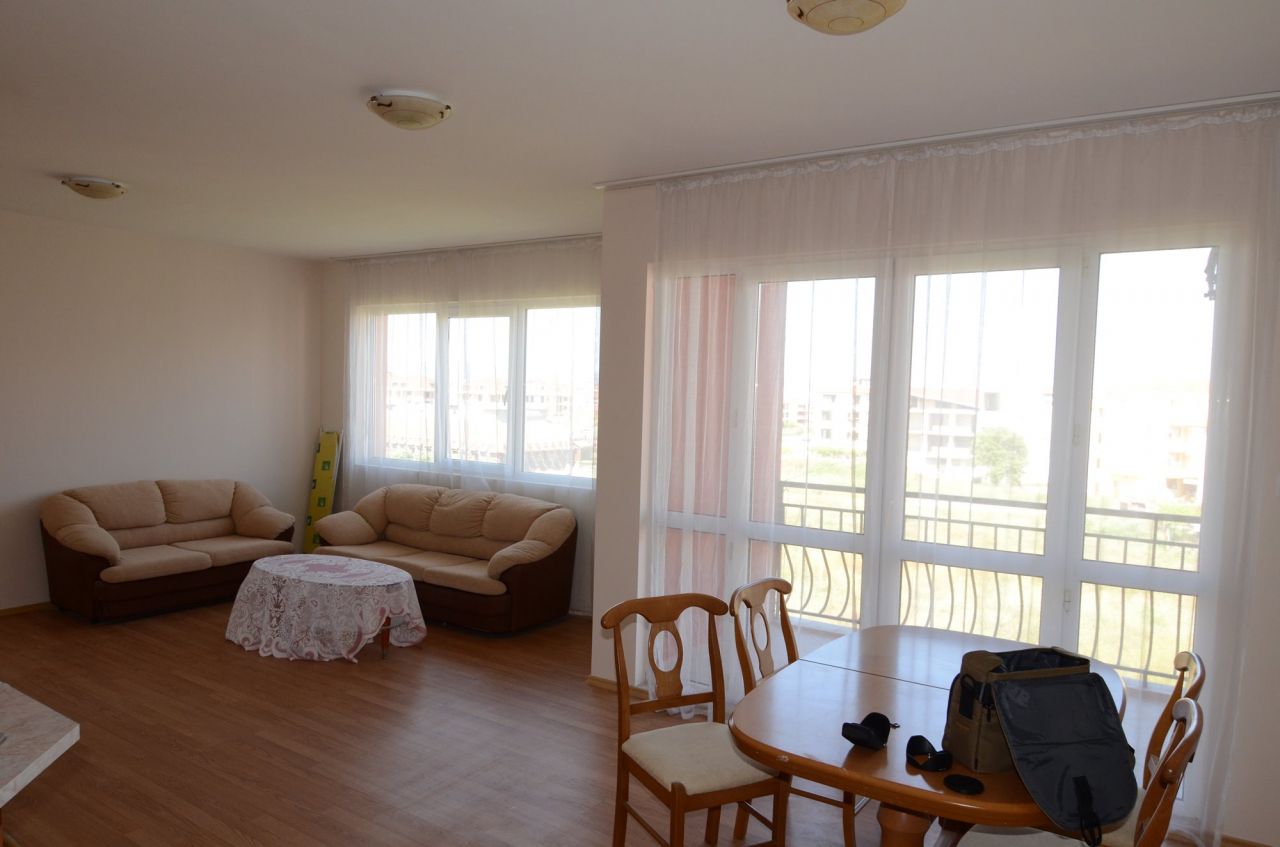 The apartment is situated on the third floor and is fully furnished as on the photos – air-conditioners, washing machine, refrigerator, oven, cooker, TV, etc. The area of the property is 80 square meters and comprises: entrance hall, bathroom, spacious living room, dining room and kitchen, a bedroom and a balcony. The property is suitable for year-round and seasonal use, but also for rent.