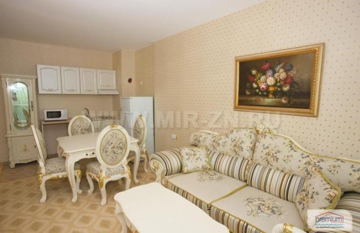 Sofa, armchair, coffee table, TV stand, TV, phone, kitchenette, square table, 4 chairs, refrigerator, built-in ceramic tiles, absorber, picture in the frame, curtains, air conditioning;