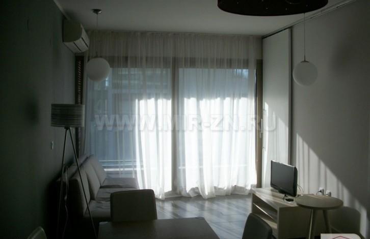 The apartment is fully furnished. There is everything. Kitchen (refrigerator, oven, etc.). Bath, toilet, washing machine. Everything new, the apartment is fully fit for life.