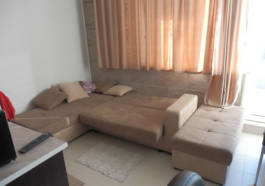 the apartment have air conditioning. She inserted furnished kitchen, a sofa bed, a table, chairs, TV, plastic table and plastic chairs on the terrace, large wardrobe, Ironing Board. The kitchen is equipped with refrigerator, utensils, appliances, stove, hood.