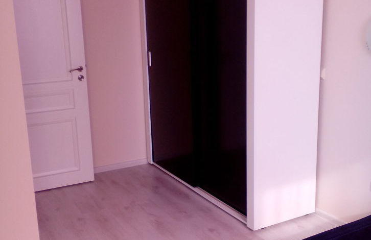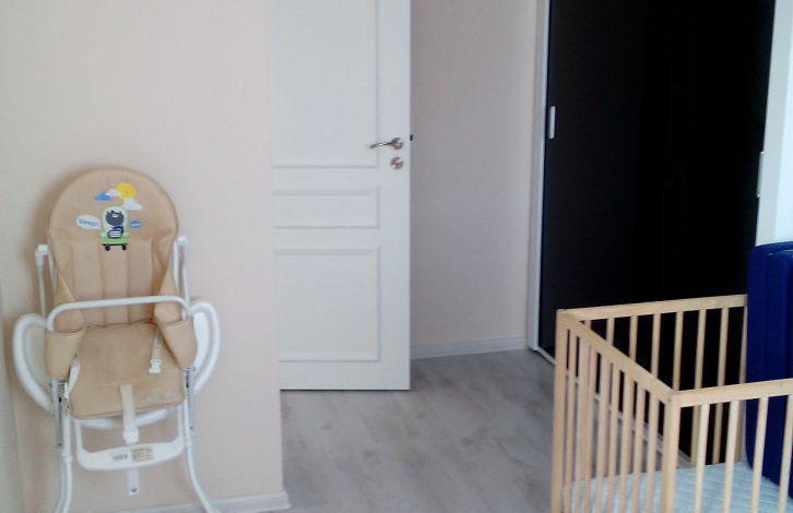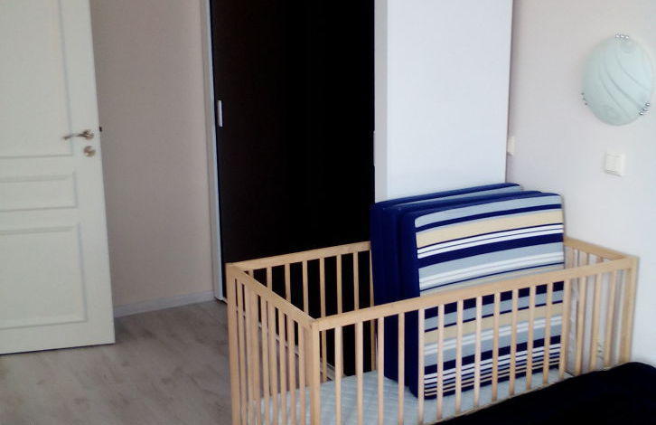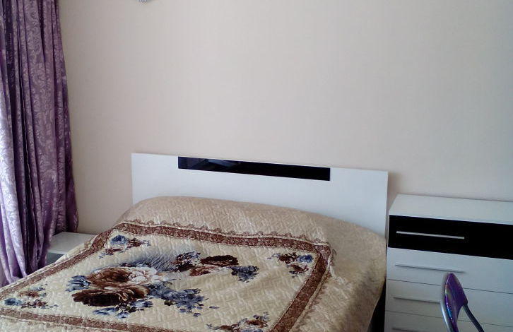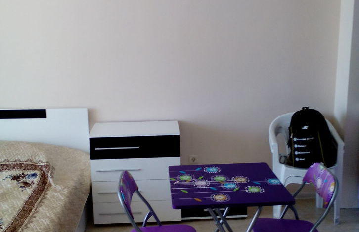 Apartment with a hall + bedroom. In the hall there is a built-in kitchen, stove, extractor fan, refrigerator, washing machine. All the necessary utensils. Double bed, chest of drawers, two bedside tables, table, 4 chairs. In the hallway, furniture for clothes and shoes. Air conditioning, works and for heating. There are many modes, including night, economy and others. In winter it is possible to live, good heating. On the floor in the hall tiles. In the bedroom there is a laminate. In the bedroom there is a double bed, a large wardrobe, a bedside table.