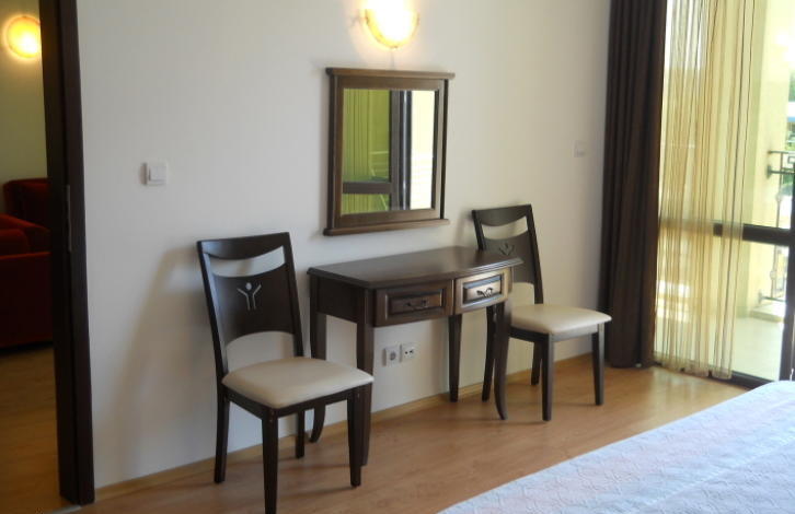 The apartment is located on the 5th floor and is sold fully furnished and equipped, ready for living. It is a corridor, a living room with a kitchen, a bedroom, a bathroom and a balcony overlooking the sea. The complex has the following amenities: reception, restaurant, swimming pool for adults and children, lobby bar, shops, security, parking,