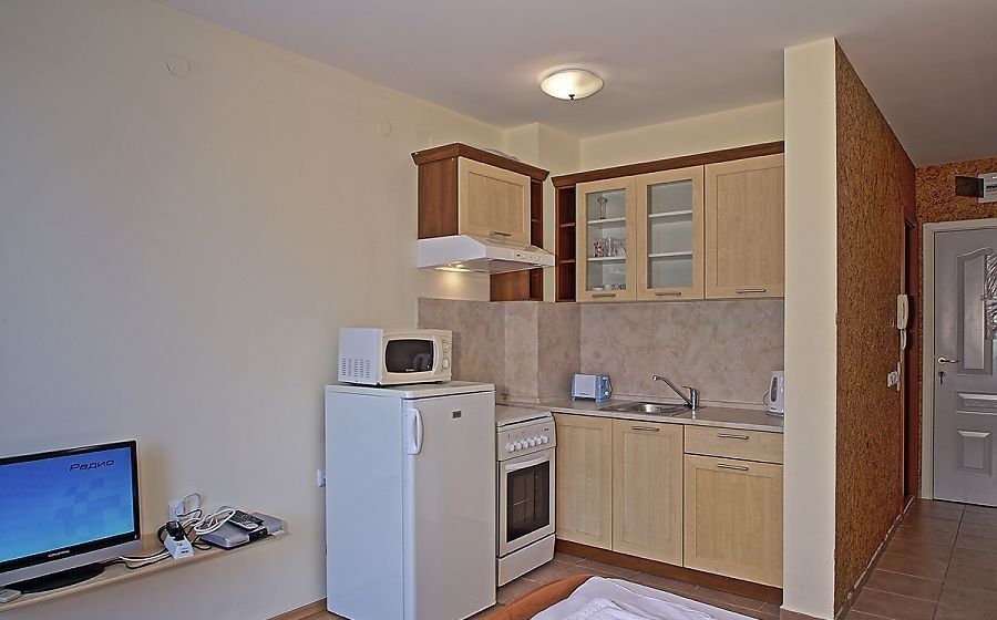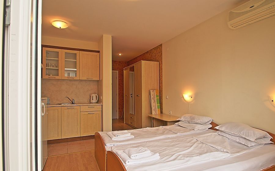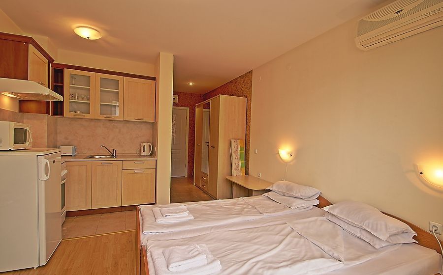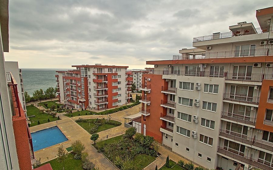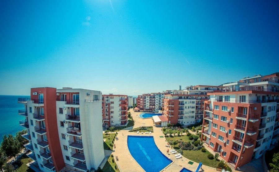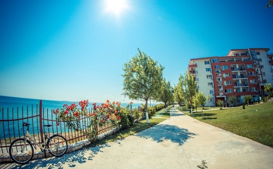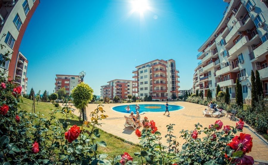 the Complex is located in a quiet and beautiful area between the city of Sveti Vlas and Elenite resort, on the beach. The view from the complex is simply incredible – gorgeous sea views overlooking Sunny Beach and the old town of Nessebar. Beautiful private beach with fine, Golden sand, crystal clear sea, combined with fresh mountain air make the complex into an exceptional place for healthy and relaxing holidays. The complex offers various possibilities for sport, relaxation and entertainment: 15 swimming pools, children's pools, water slides, playgrounds, tennis court, fitness centre, medical centre, supermarket, 4 restaurants, round-the-clock security and maintenance, green areas, Parking lot. The use of Parking spaces and sun loungers by the pool for free!
