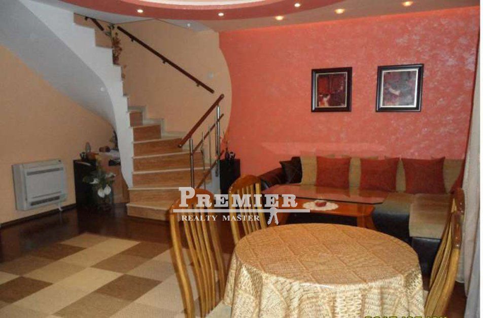 the Apartment is a Maisonette. On the ground floor a spacious living room with kitchen area, bathroom and terrace. The second floor has two bedrooms and a bathroom. Area apartment 115 m2, on the 2nd floor. The building is new, built in 2009. The apartment is offered with furniture and appliances.