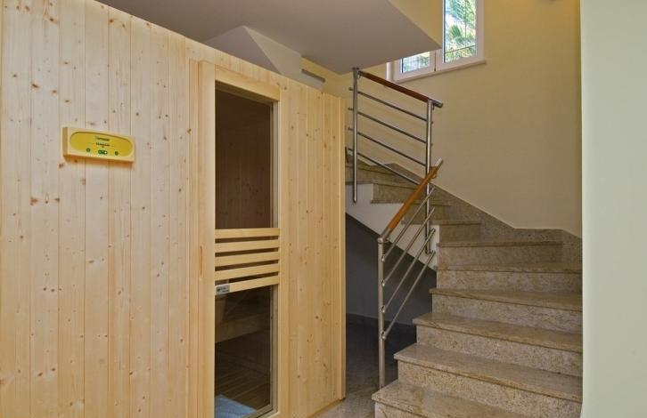 -First Floor: a bedroom, a room with sauna, bathroom and garage, first floor: kitchen, dining room, living room and terrace, second floor: two bedrooms, two bathrooms and a terrace.