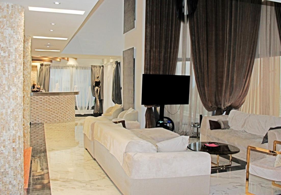 For sale 3-storey Villa of 430 sqm In Paphos. The first floor consists of living room with kitchen, living room, one bathroom. The second floor consists of 3 bedrooms, one bathroom, 2 shower rooms, one dressing room. The basement consists of one storeroom, one sauna, Jacuzzi. The Windows offer views of the sea, the mountains. The object has solar panels for water heating, fireplace, air conditioning, awnings, barbecue, heating. The property is sold with furniture. The building is an Elevator. The object has an alarm system. To the property belongs a Parking place, garden, garage. The on-site swimming pool personal use.