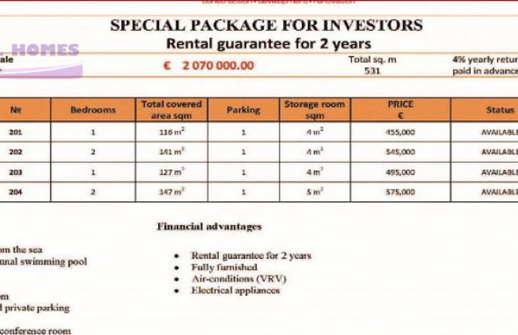 SPECIAL PACKAGE FOR INVESTORS Rental guarantee for 2 years LUXURY APARTMENTS In the Sea front area of Limassol, Cyprus just 80 meters from the sea A perfect opportunity for property-seekers to own an impressive complex just 1 minute walk to the Mediterranean Sea. Designed in a modern cubist style, this luxury complex is constructed to the highest standards using the latest techniques and the finest quality building materials, the exterior styling and finishes are matched by superb interior finishes and fittings. Located in one of the finest areas of Limassol and only 50m from the sea, Essex complex is Delivered with guaranteed title deeds. Delivery date: December 2017 PLAYROOM SAUNA BAR CONFERENCE 24HR CONCIERGE SURVEILLANCE SYSTEM 50M FROM THE MEDITERRANEAN SEA SWIMMING POOL WITH SEA WATER PROVISION FOR ELECTRIC SHUTTERS VRV COOLING AND HEATING SYSTEM LARGE 1,2 & 3 BEDROOM APARTMENTS FULLY FURNISHED ELECTRICAL APPLIANCES STORAGE ROOM COVERED PARKING