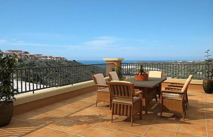 Luxurious apartment in a quiet area with a magnificent view of the sea and the mountains. Additional extras: solar panels, built-in air-conditioners, kitchen appliances, a garden, three large communal swimming pools.