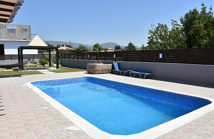 Beautiful villa with 3 bedrooms located in a quiet residential area of the village of Pareklisha. Specifications: 3 bedrooms, 3 bathrooms, the villa is fully furnished with fully equipped kitchen, air conditioning in all rooms, central heating, covered parking, private pool, whirlpool, large garden.