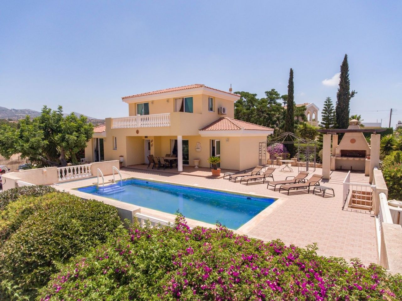 4 – спальная роскошная вилла, с 4 – ванными комнатами, стоит на участке площадью 1450 кв.м., и находится в городе Пафос - Коралл Бэй!!! Хозяин дома приобрел еще один участок земли, площадью 600 кв.м., и оба участка включены в цену дома!!! Фантастический вид на море!!!