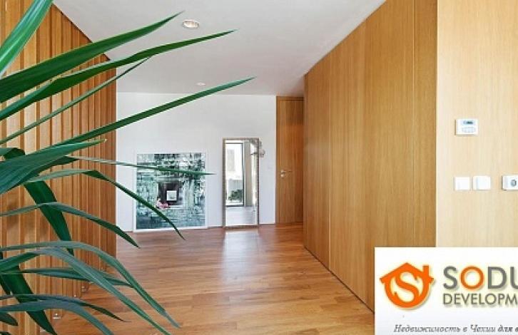 Дом расположен в жилом комплексе На Крутци. В восточной части ареала находится спортивный зал и открытые площадки для тенниса и игр с мячом, газон с детской площадкой. Дом находится недалеко от остановки трамвая и новой строящейся станции метро в А. Архитектурный дизайн дома решен так, что при строительстве были использованы вневременные материалы не требующие обслуживания, такие как кирпич и бетон.На подземном этаже есть гараж на 2 машины и 2 комнаты. В первом этаже находится просторная гостиная со столовой с выходом на террасу и ванная комната. На этом этаже возможно разделить пространство на отдельные просторные спальни. На втором этаже находятся две спальни и ванная комната. Остановка дома: полностью оборудованная кухня, деревянные полы, встроенные шкафы.