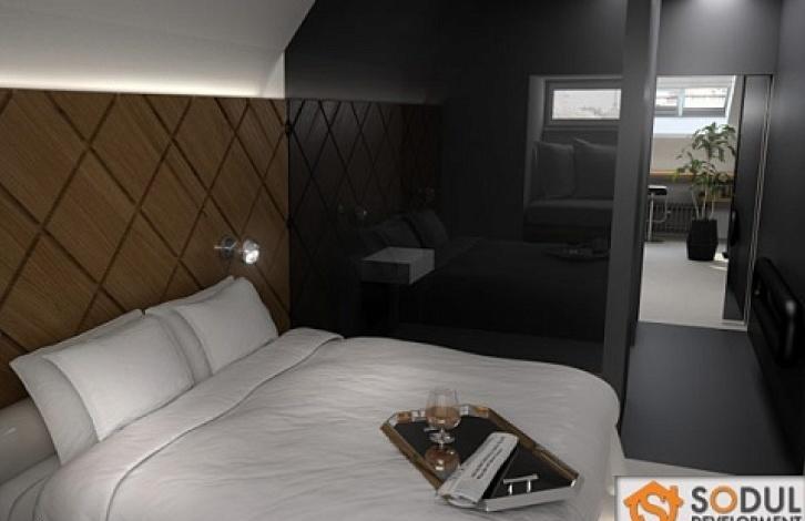 Данная квартира на 5-м этаже имеет прихожую, гостиную с открытой планировкой и кухней, спальню и ванную комнату.
