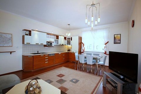 for Sale apartment 3+KK with an area of 93m2, with two separate bedrooms, a large living room-dining room, a Conservatory and a patio. In the new house, the first European floor with Elevator, in the historical Spa centre of Karlovy vary. To sources 5 minutes walk. The apartment is in excellent condition, equipped with modern furniture, household and lighting appliances, curtains and svetozashitnogo. In the apartment there are two kinds of heating: total Central (radiators) and floor (electric floor). Ceiling height of 2.75 m. Covered terrace (veranda 27 m2) - for year-round use, a sofa, a wall, a coffee table, Underfloor heating, sun blinds. Open terrace of 15m2.