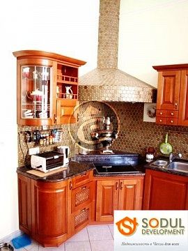 Шикарный интерьер удовлетворит самый взыскательный вкус: японские мозаики в ванных комнатах, плитка из натурального сланца, антикварная мебель, голландские люстры ручной работы и многое другое.