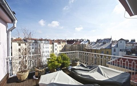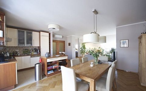 Солнечная просторная квартира с 2 террасами на 5-м этаже полностью отреставрированного дома с лифтом, расположенного в одном из наиболее популярном и престижном районе Праги - Винограды, всего в нескольких шагах от станции метро и трамвайной остановки Намнести Мира.