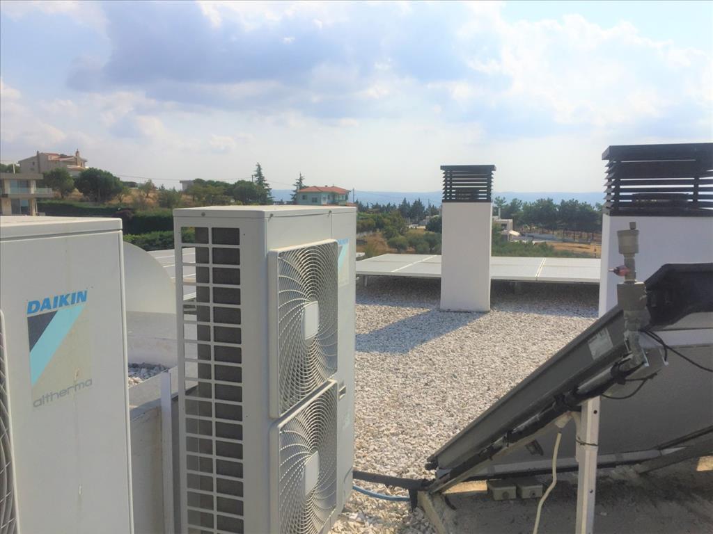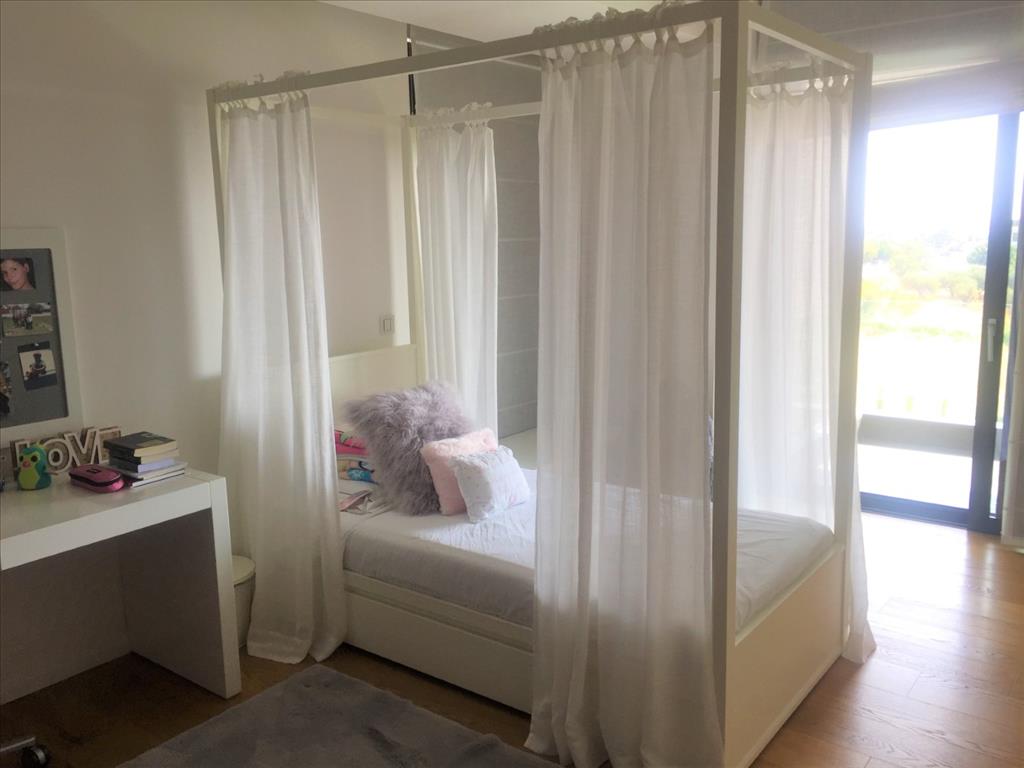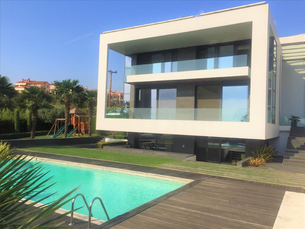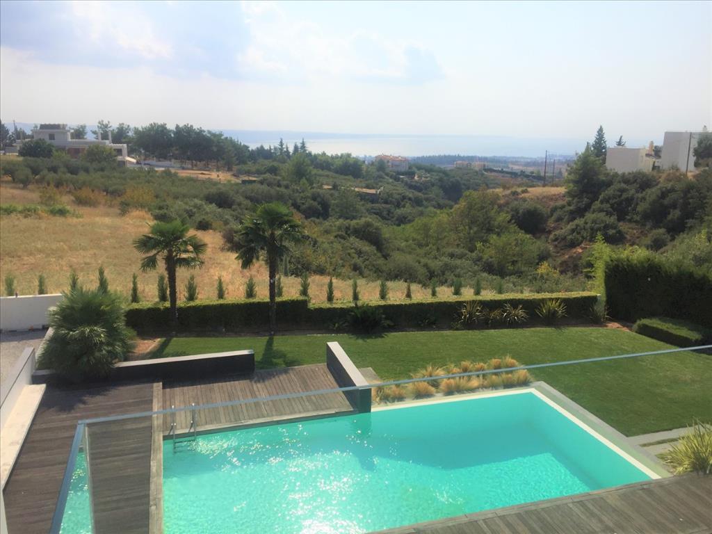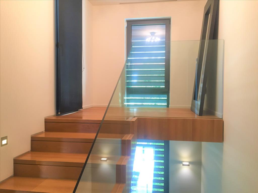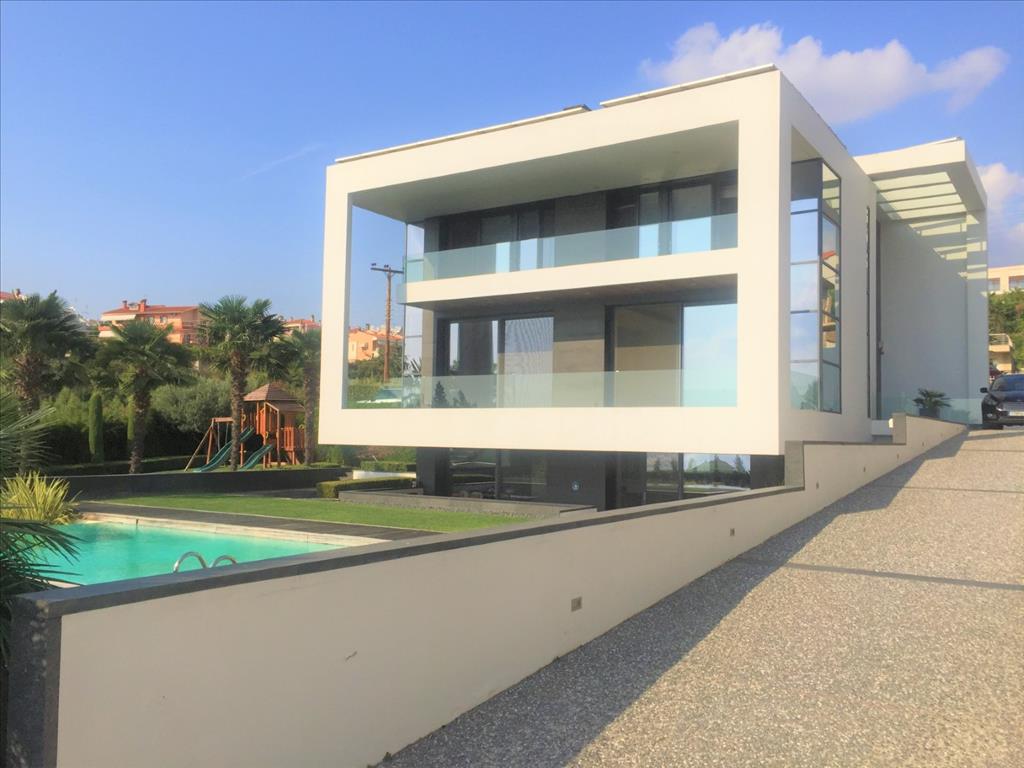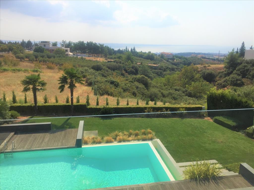 For sale 3-storey Villa of 400 sq m in Thessaloniki. The first floor consists of 2 bedrooms, living room with kitchen, 2 bathrooms, one storeroom. The second floor consists of living room with kitchen, one shower room. The third floor consists of 3 bedrooms, one bathroom, one shower room, one dressing room. The Windows offer a magnificent view of the sea, the mountains, the city, the forest. The object has solar panels for water heating, fireplace, air conditioning, heating. The object has an alarm system. To the property belongs a Parking space, garden. The on-site swimming pool personal use. The cottage is situated in the heart of Panorama.