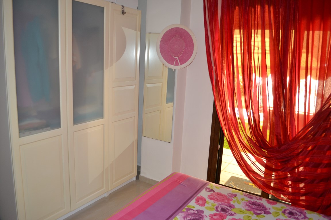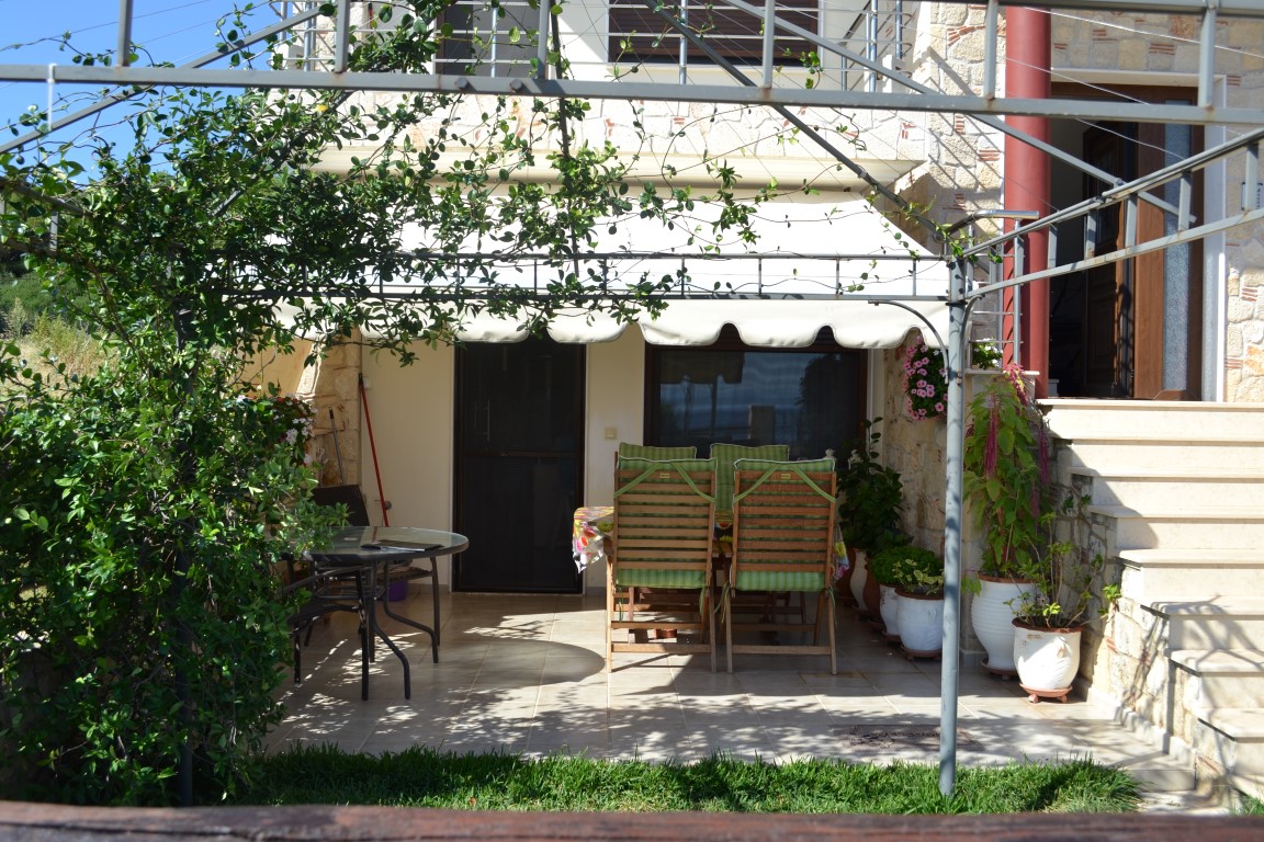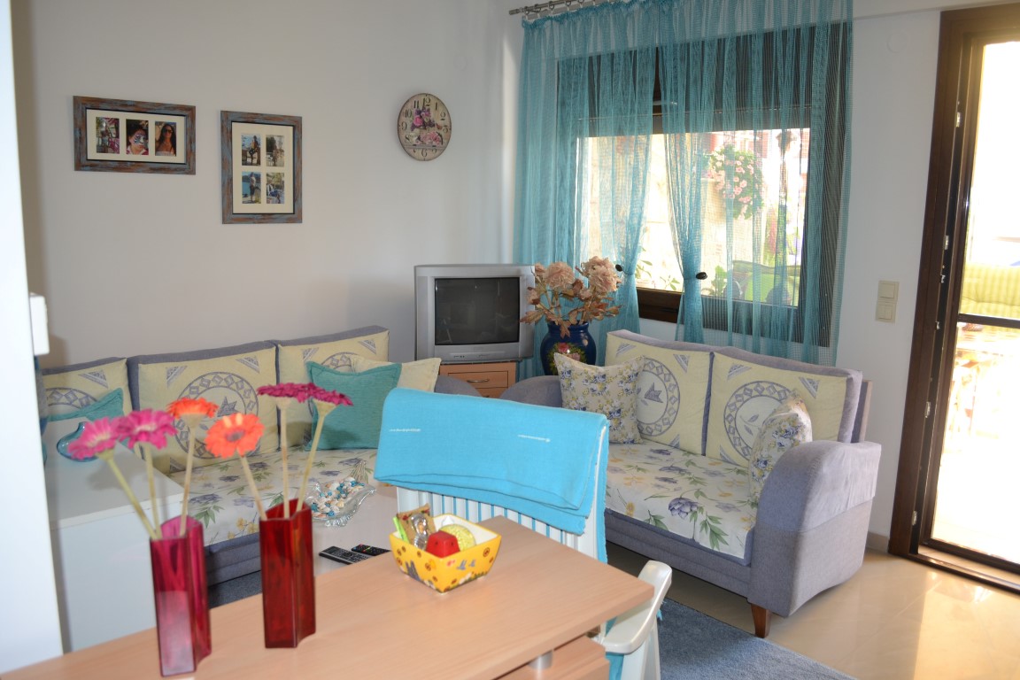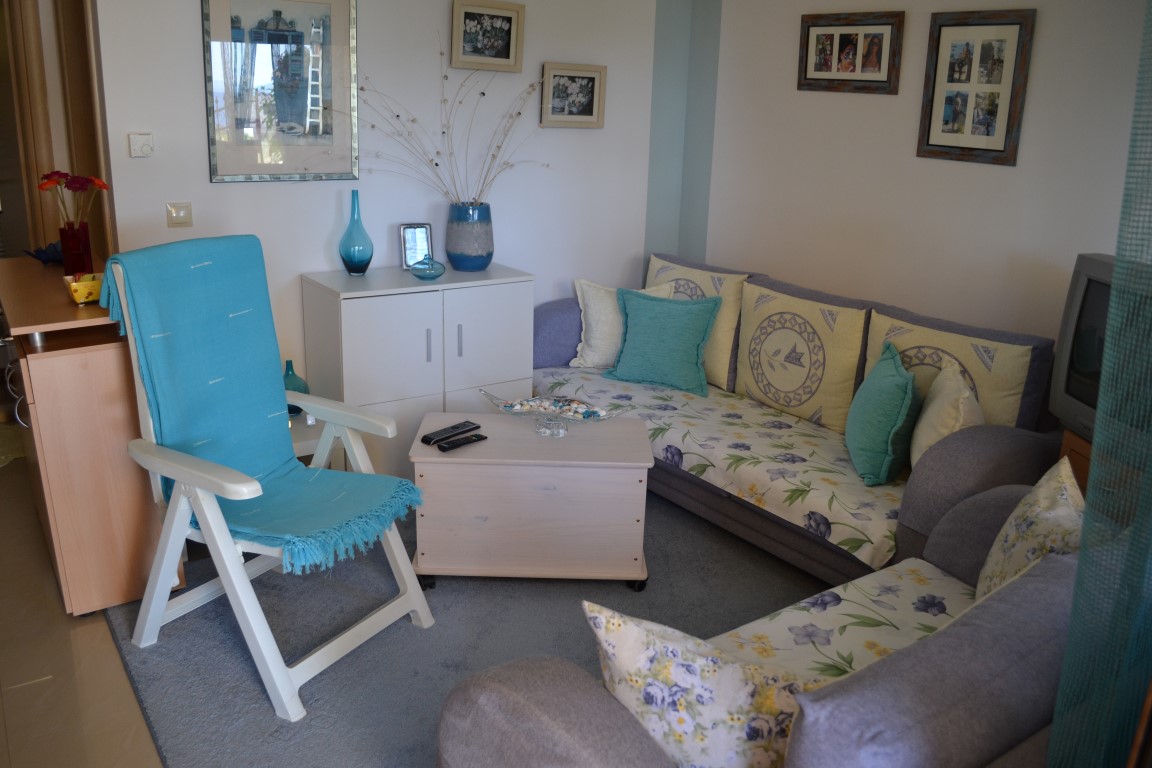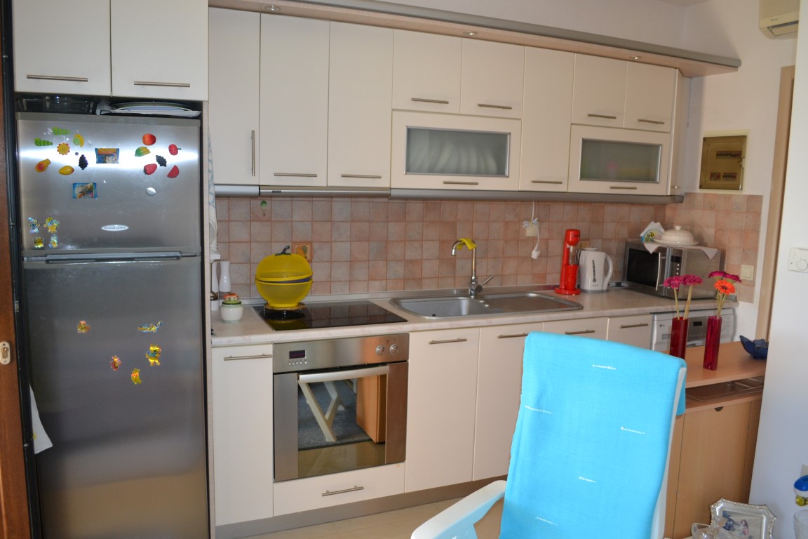 Apartment for sale 45 sqm on the Kassandra Peninsula, Halkidiki, Greece The apartment is located on the ground floor and consists of one bedroom, living room with kitchen, one shower room. The apartment has a corner location. The Windows offer views of the sea. The object has air conditioning, awnings, barbecue area. To the property belongs a garden.