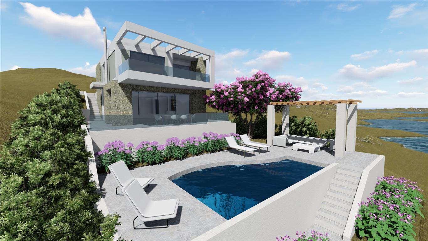 For sale 2-storey Villa with an area of 132 sqm in Sithonia, Halkidiki, Greece The first floor consists of one bedroom, living room with kitchen, one shower room. The second floor consists of 2 bedrooms, 2 bathrooms, one storeroom. The Windows offer a magnificent view of the sea. The object has solar panels for water heating, fireplace, air conditioning, barbecue, heating. To the property belongs a Parking space, garden. The on-site swimming pool personal use. The project “MUSE” in Kriaritsi two-Storey house of 132 sq m situated on a plot with a slope and has 2 floors. The first floor has kitchen, dining room and living room single space, a sleeping room and a bathroom. The living room has a fireplace, with shared spaces there are exits to the terrace. The second floor has two bedrooms with EN Suite bathrooms and exits to the balcony and utility room which can be used as a Laundry or storage room.The construction of the pool included in the price. Additionally there is the possibility of building a basement with an area of 81 square meters, can accommodate a gym, sauna, two bedrooms with natural light and a shared bathroom. The cost of the turnkey project of 500 000 EUR(plot 500 sqm, house, landscaping)