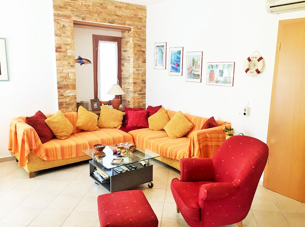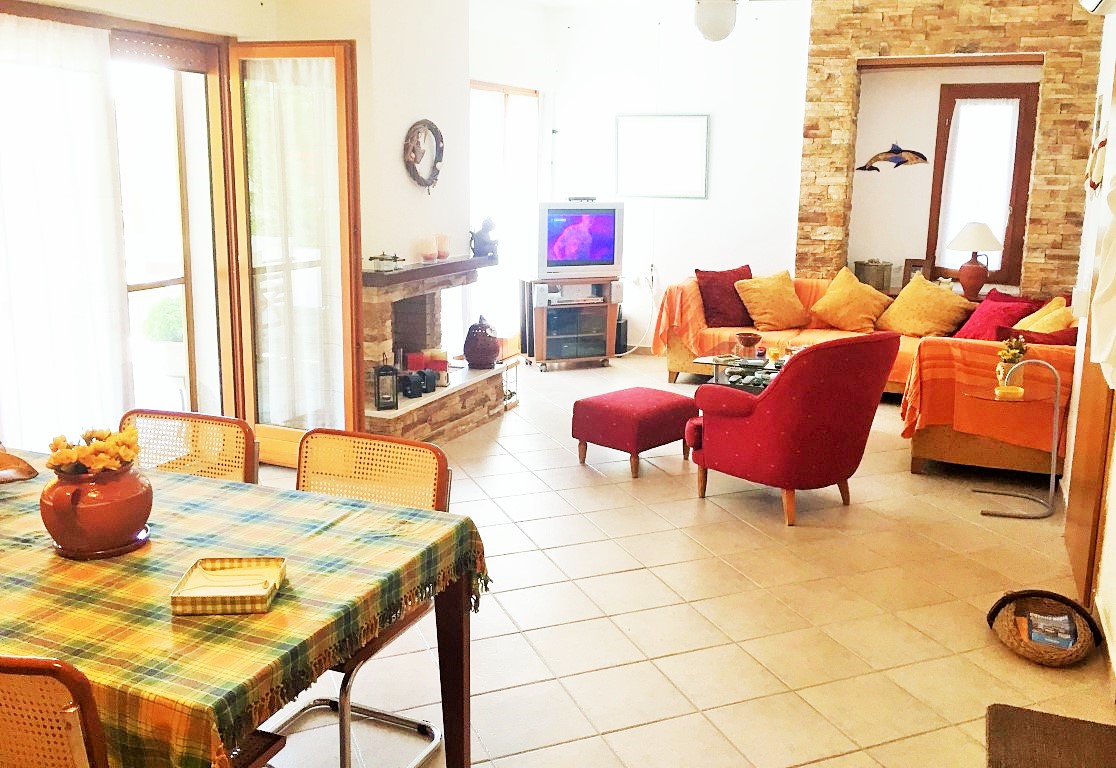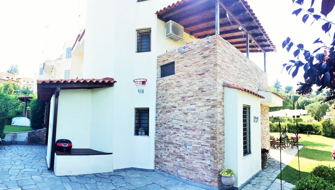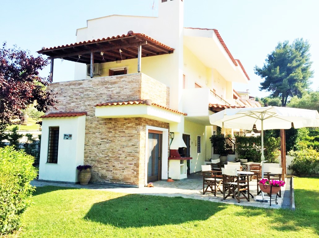 Sale house area of 110 sqm on the Kassandra Peninsula, Halkidiki, Greece The townhouse is on 3 levels. The first floor consists of living room with kitchen, one bathroom. The second floor consists of 2 bedrooms, one shower room. The third floor consists of one bedroom, one storeroom. The Windows offer a magnificent view of the mountains, the forest. The object has a fireplace, air conditioning, awnings, barbecue, heating. The property is sold with furniture. The object has an alarm system. To the property belongs a Parking space, garden.