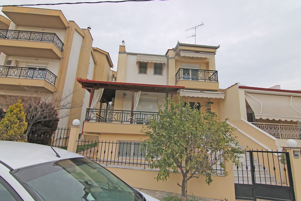 For sale 3-storey cottage with an area of 192 square meters in the suburbs of Thessaloniki. The first floor consists of one bedroom, living room with kitchen, one shower room. The second floor consists of living room with kitchen, one bathroom. The third floor consists of 3 bedrooms, one bathroom. The Windows offer views of the sea. The object has a fireplace, awnings. The object has an alarm system. To the property belongs a Parking space.