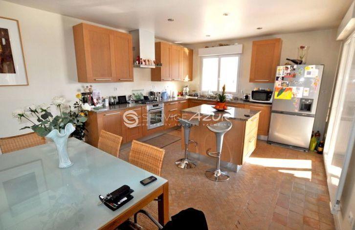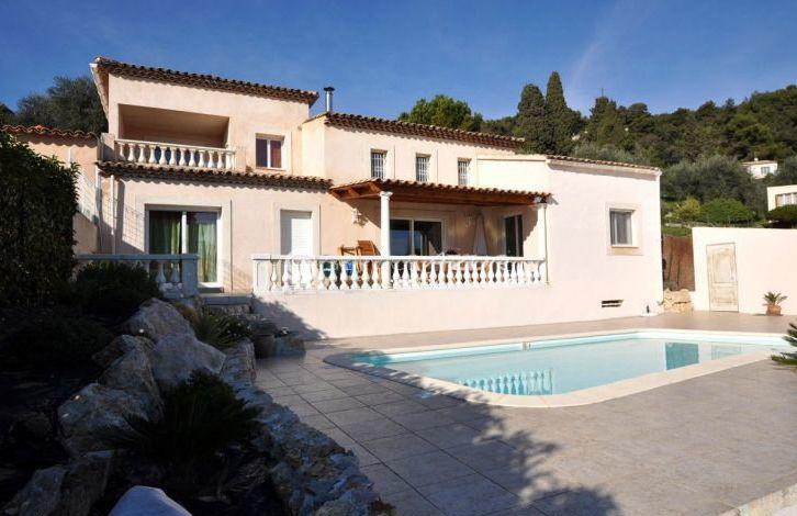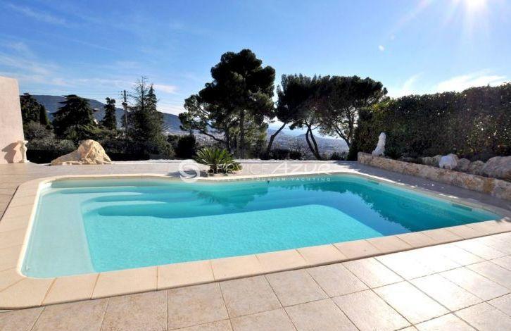 Elegant two-storey villa on the French Riviera of France with a sea view, an area of 160 sq. m., is located on the hills behind Nice. Functional and modern layout. Living room, modern kitchen and dining room open plan, fully equipped. 3 bedrooms, 3 bathrooms, mezzanine. A cozy veranda is a superb place for lunch with family and friends. The house is surrounded by a beautiful garden of 1500 sq. m. Sunny terrace with pool. There is a garage.