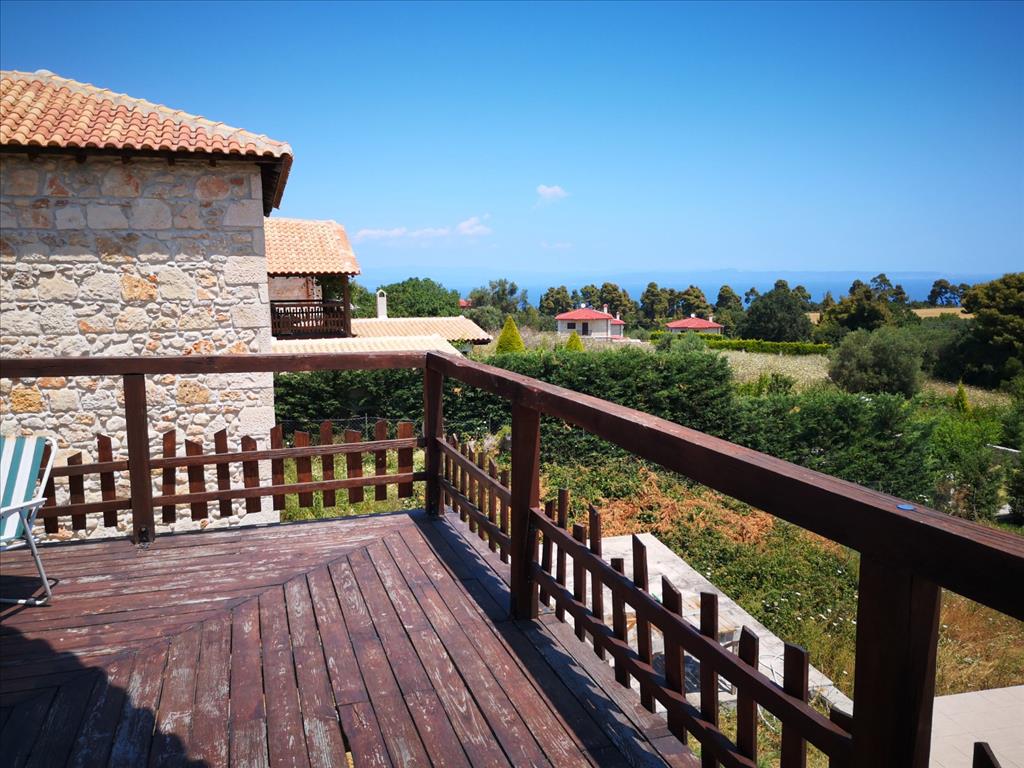 For sale 2-storey cottage area of 90 sqm in Kassandra, Halkidiki, Greece The first floor consists of living room with kitchen, one shower room. The second floor consists of one bedroom, one shower room. The Windows offer a magnificent view of the sea, the mountains and the forest. The object has a fireplace. The property is sold with furniture. To the property belongs a Parking space, garden.