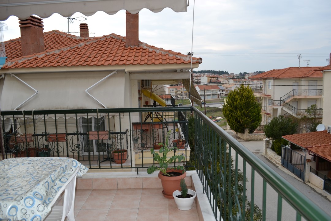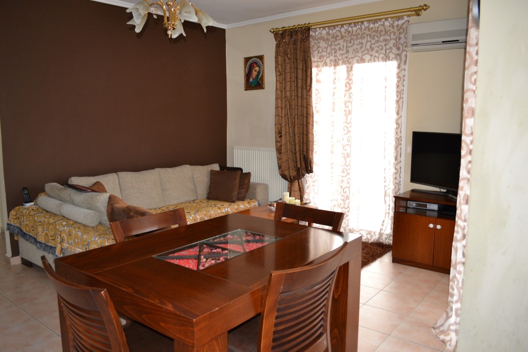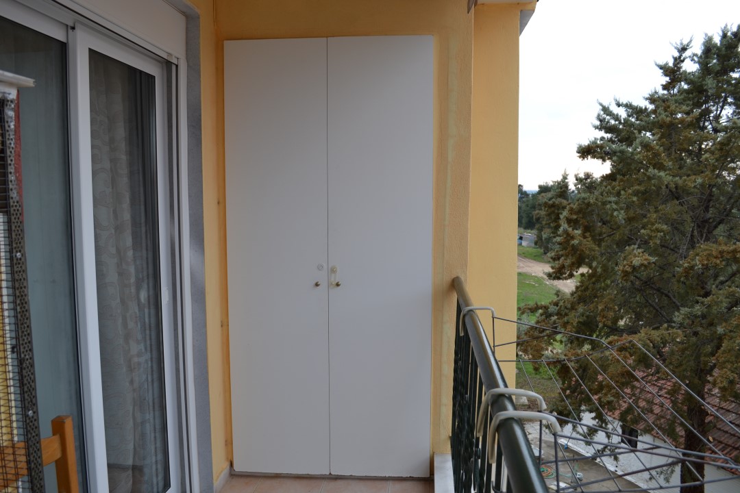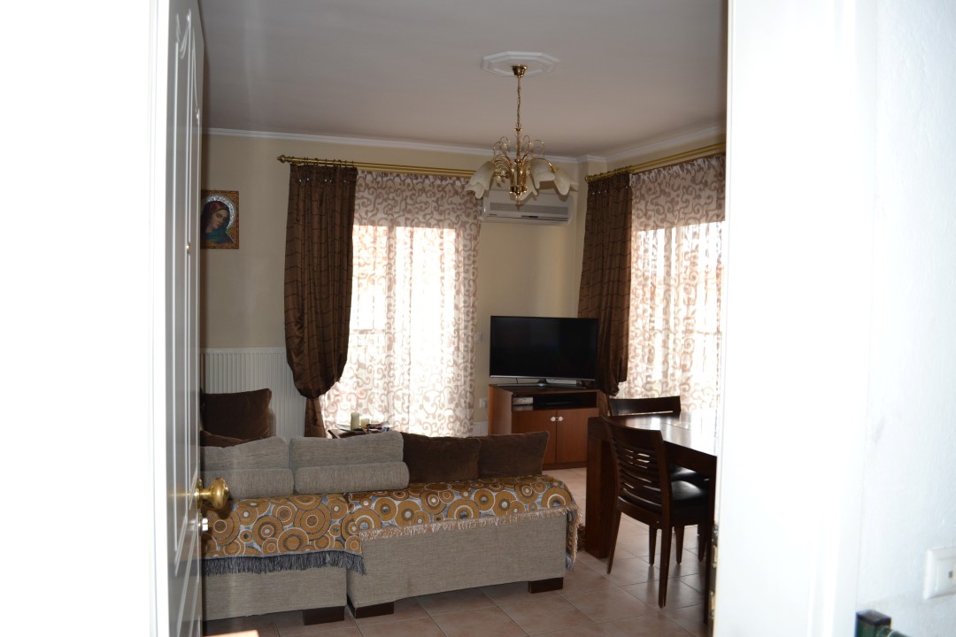 For sale apartment with an area of 63 sqm on the Kassandra Peninsula, Halkidiki, Greece The apartment is located on the third floor and consists of 2 bedrooms, living room with kitchen, one bathroom. The apartment has a corner location. The Windows offer views of the city, the forest. The object has solar panels for water heating, air-conditioner, tents, heating. The property is sold with furniture.