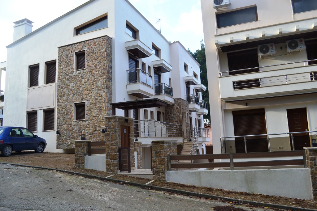 Apartments for sale 100 sqm on the Kassandra Peninsula, Halkidiki, Greece Townhouse is on 2 levels. The second floor consists of 2 bedrooms, living room with kitchen, one bathroom. The third floor consists of 2 bedrooms, one bathroom. The townhouse enjoys a corner location. The Windows offer a magnificent view of the sea, the mountains and the forest. The object has a fireplace, barbecue area. In there two townhouse.