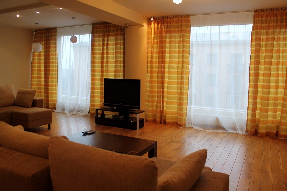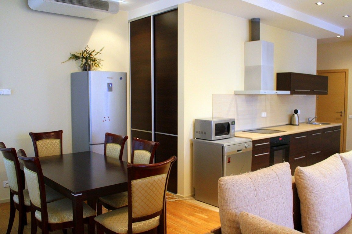 There are two big bedrooms + living room with kitchen. Fully furnished with modern furniture. There is a sauna! Hardwood floors, new plumbing, high ceilings. The apartment has all the necessary equipment. It is possible to rent an underground parking! View to St. Michel and side views of the Daugava! The house is located in the prestigious district of Riga! 5 minutes walk to the Old Town, 5 minutes walk to the quiet center of Riga!
