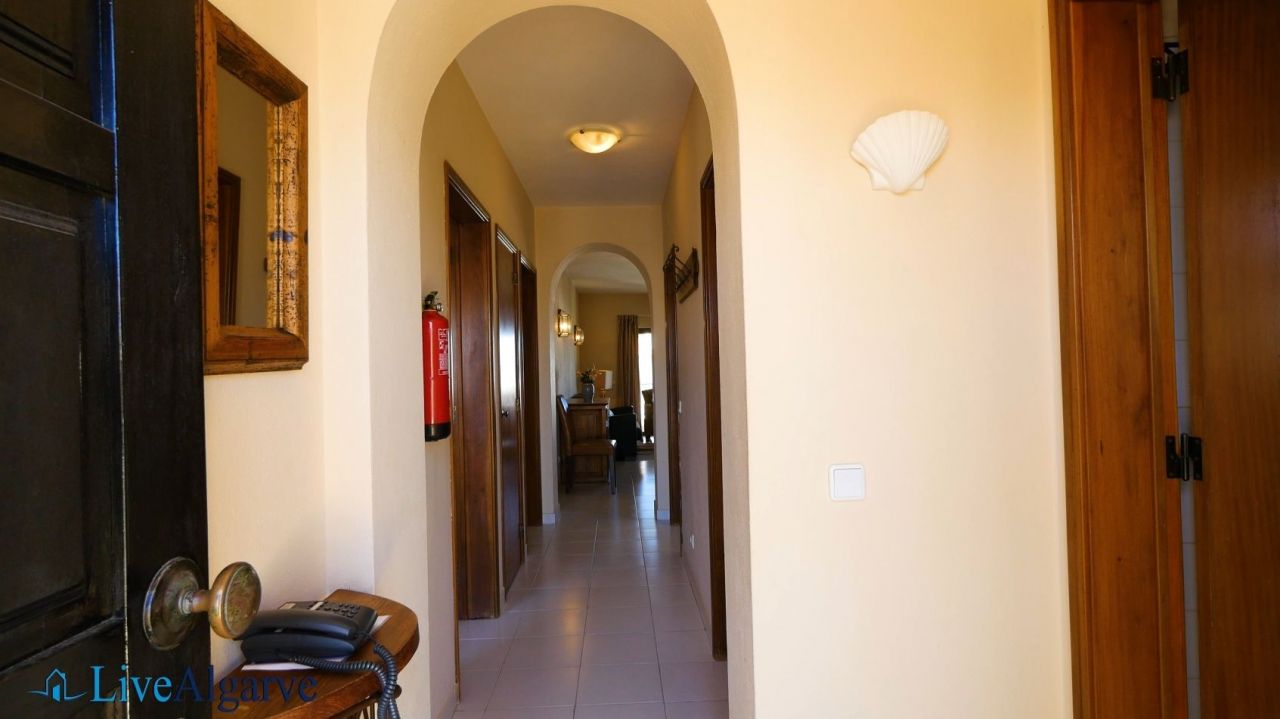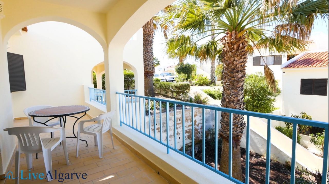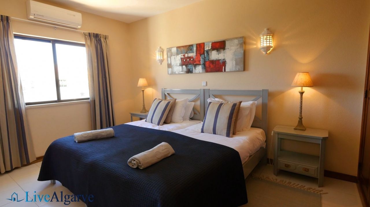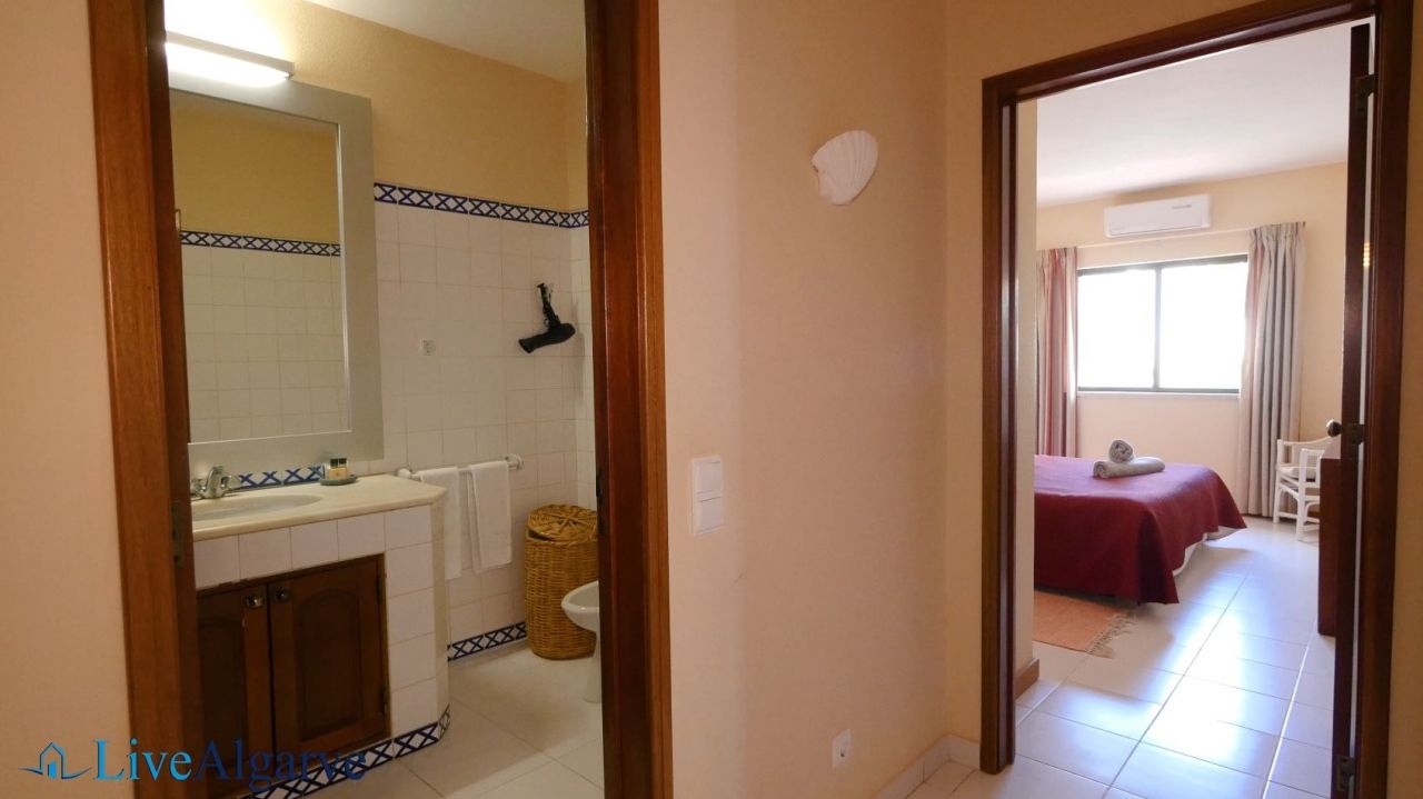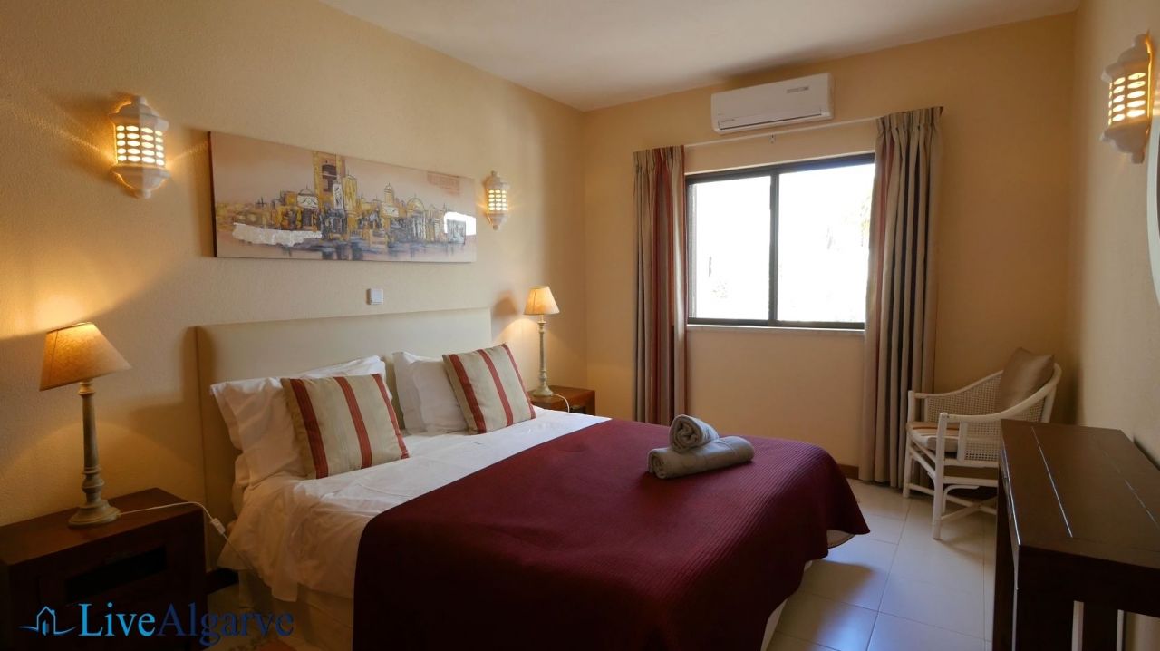 This very tastefully furnished T2 apartment is located in the heart of the picturesque village of Carvoeiro in the district of Lagoa. The apartment consists of a living room, two bedrooms with fitted wardrobes, two bathrooms, a fully equipped kitchen and a storage room. The property belongs to a very nice, private condominium, which has a well-kept outdoor area with one pool for adults and one for children. In addition to the lovingly planted garden, there are also two tennis courts, terraces, a reception and parking spaces.