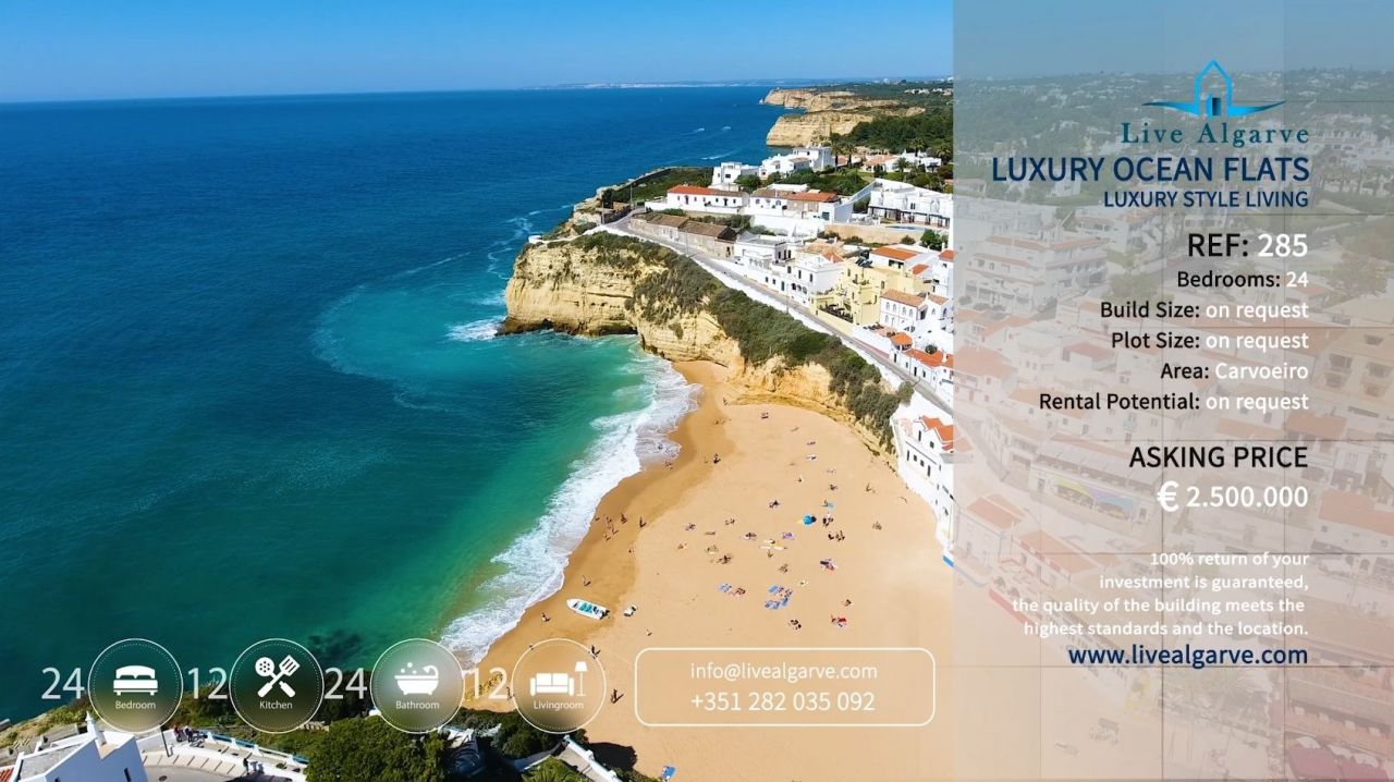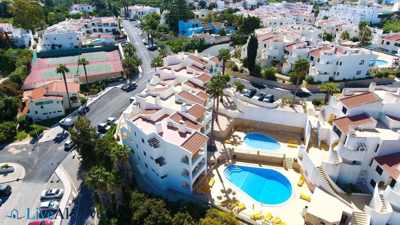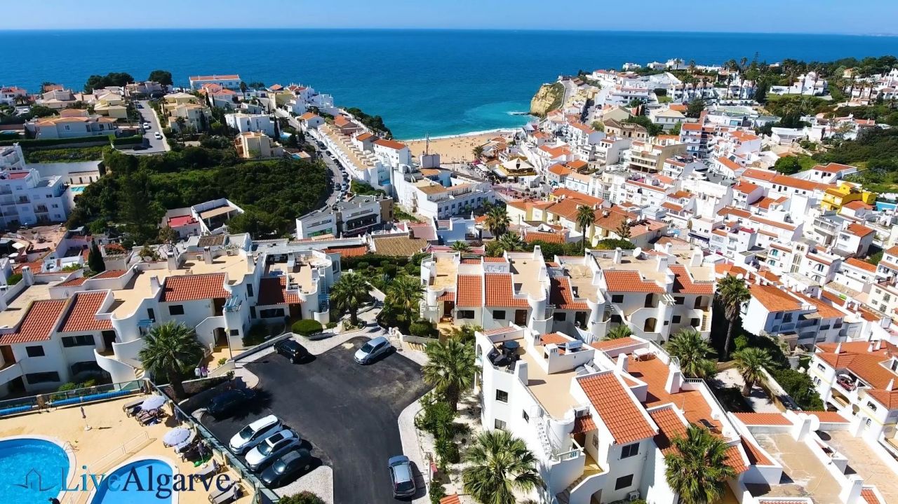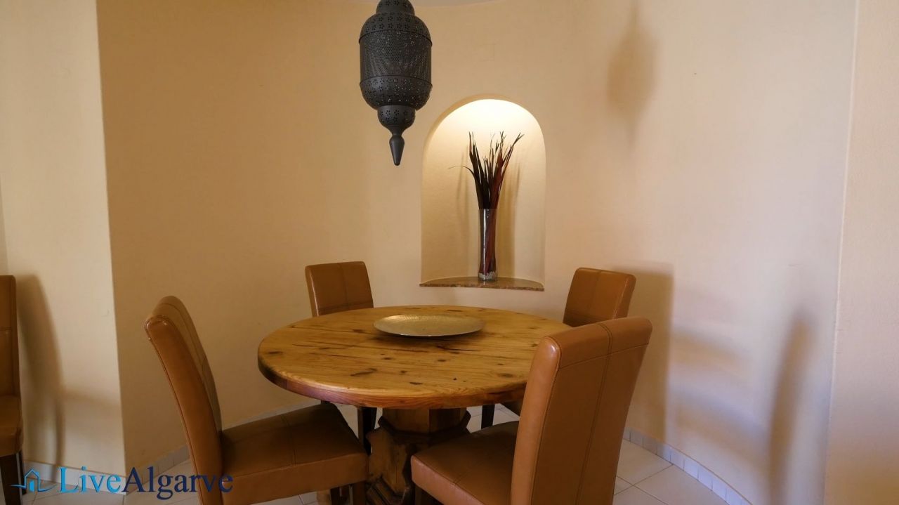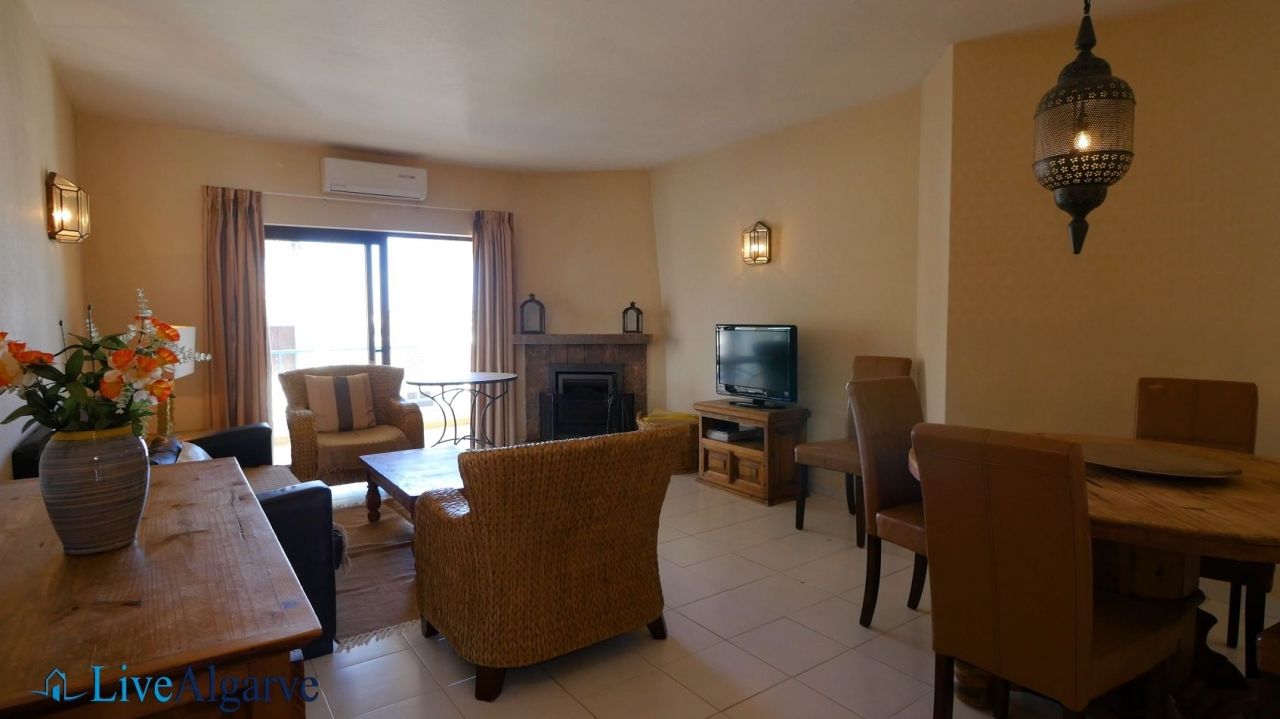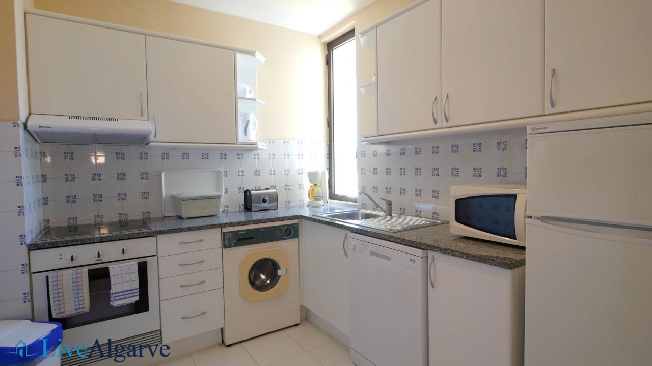 This very tastefully furnished T2 apartment is located in the heart of the picturesque village of Carvoeiro in the district of Lagoa. The apartment consists of a living room, two bedrooms with fitted wardrobes, two bathrooms, a fully equipped kitchen and a storage room. The property belongs to a very nice, private condominium, which has a well-kept outdoor area with one pool for adults and one for children. In addition to the lovingly planted garden, there are also two tennis courts, terraces, a reception and parking spaces.
