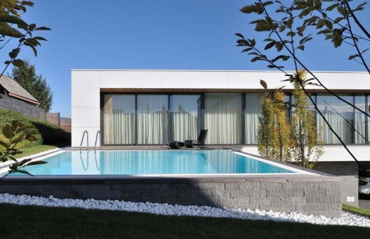 The house is an amazing and outstanding property with magnificent views of the surrounding hills and countryside. Distinctive and modern design, which incorporates elements of modernist architecture of the Bauhaus school of the thirties of the last century. On the lower floor there is a garage, Laundry/boiler room and office with French doors. The upper floor has an open plan living room with kitchen with direct access to the garden. Pool rooms, to the garden where there is enough space to relax outdoors and enjoy the views. The feeling of spaciousness and comfort living blended with outdoor living. Also upstairs are two bedrooms with bathroom, guest toilet and a large bright master bedroom with a private bath. This modern property is situated in a newly developing upmarket area on the hillside Golovtsov. The Villa is designed for a modern lifestyle in a minimalist style. Refined style and equipment of high quality standard complement the simplicity and functionality of the house. Great lighting emphasizes purity, quality and perfection in interior design. Luxury Villa on the outskirts of Celje is ready for accommodation and is sold with furniture and equipment, and if desired also with all the artificial works. Our opinion: Villa characterize of beautiful architecture, high standard quality, modern style and desirable location close to town centre with lovely views, which together offer a comfortable and modern lifestyle.