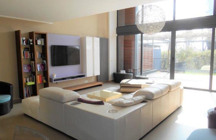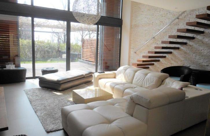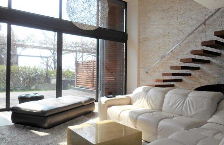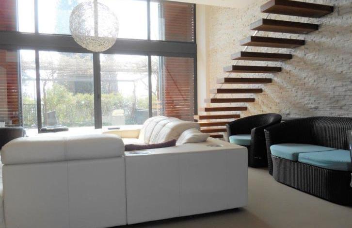 V Portorozu je 2 min od mestne plaze prodan sodoben luksuzni apartma z velikimi panoramskimi okni, visokimi stropi, zasebno garazo za 2 avtomobila. Neto povrina apartmaja je 170,88m2, bruto 214,81m2. Stanovanje je tri nivoje. On the first level there is : a garage, a closet, a toilet, a utility, a guest room with a private bathroom. On the second level : a large open space in which there is a kitchen with a kitchen island, a dining room and a living room with access to a large terrace and a lawn offering privacy, an abundance of greenery and a beautiful view. On the third level (in the gallery): a bedroom, a children's room, a shared bathroom and an atrium. All the furniture of the high-priced category is made to order, household appliances Miele (washing, drying and dishwashers, coffee maker, steam oven combined with the classic, microwave combined with the classic), DeDietrich cooker and teppaneyaki, refrigerator Liebher new gas boiler Beretta, air conditioning , 2 TVs.