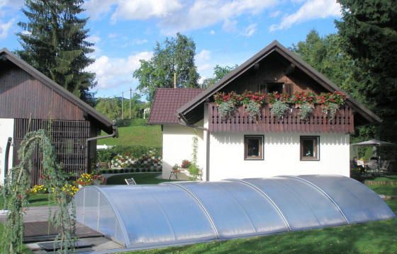 The old peasant house was built in 1881 and was last renovated during the period from 2006 to 2009. The house has 161 m2 of net living space. The site is located in an idyllic location and includes 1,285 m2 of land for development and 12,446 m2 of agricultural land (garden and pasture). From the town of Kamnik the house is located only 5 km away from Ljubljana, the ski resorts of Krvave and the thermal resorts of Snovik about 25 km from the airport - 15 km. The first floor has an entrance hall, kitchen, living room, bathroom with toilet, pantry with gas central heating and a washing machine. On the second floor there is an entrance hall with access to the gallery and two bedrooms. The bedroom in the attic with a double bed has a place for storing bedding and other things behind the closet, the bedroom has an exit to the balcony overlooking the sunset behind the hills. Another attic bedroom with two beds offers the possibility of sleeping from 2 to 4 people. Part of the house has a basement. Heating of the house is possible with the help of a wood stove in the living room or gas heating. From the kitchen there is an exit to the terrace, not overlooking the hills to the south of Ljubljana and to Snnk. The terrace in the summer heat gives the shadow of a mighty old lime tree. In the south-western part of the house there is an indoor swimming pool 3. 5 x 7. 5 x 1. 4 m, near the pool there is a toilet. On the site there is also an economic building with a garage and a canopy, also a room for firewood, a garden and a garden. The house is also suitable for rental for tourist purposes.