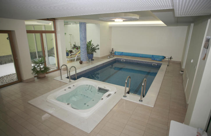 Layout: ground floor: huge garage for 4 cars with heated floors, Elevator, indoor swimming pool, Jacuzzi, Finnish sauna, Laundry room, cold cellar and a room for receiving guests. There is also the possibility of installing a fireplace and toilet. The ground floor also has a kitchen, a pantry and a study with bookshelves and a guest toilet.