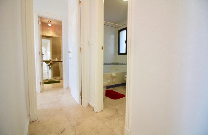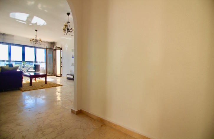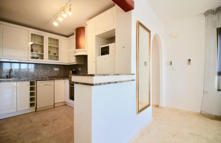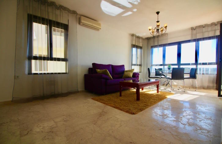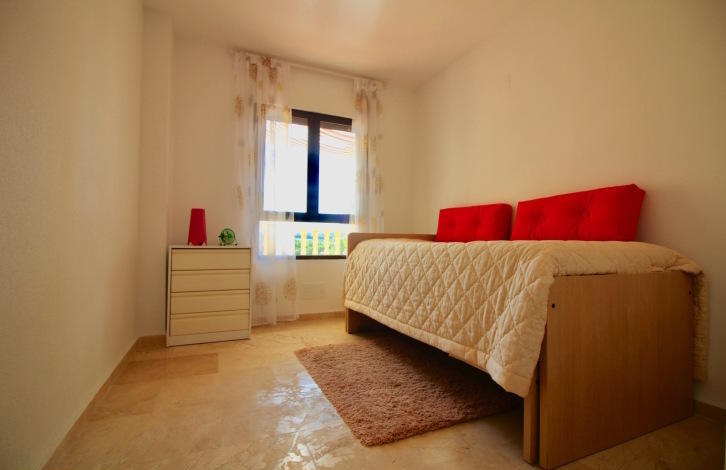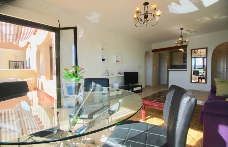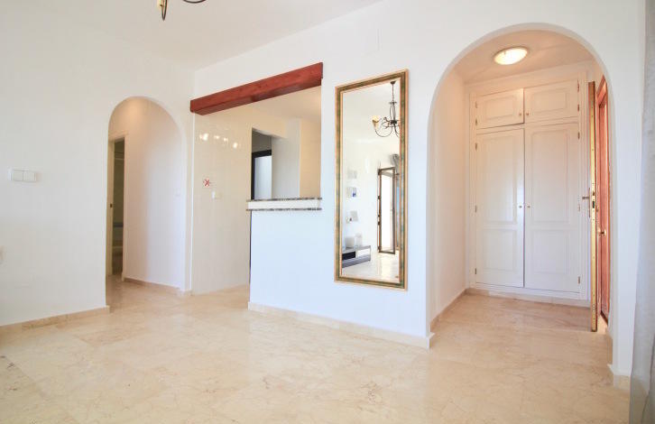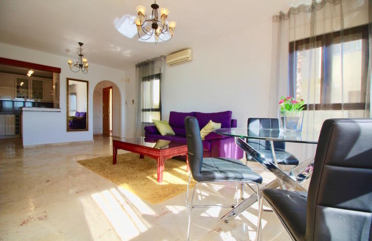 На входе в апартаменты расположилась небольшая прихожая, которая ведет нас в просторную гостиную с открытой кухней и выходом на солнечную террасу! С террасы открывается потрясающий вид на популярные гольф поля Лас Рамблас! Открытая кухня полностью укомплектована всей необходимой бытовой техникой и имеет выход на просторное патио, которое можно использовать как комнату для хранения или постирочное помещение! Справа от гостиной, Вы найдете небольшой коридор, который ведет нас в спальни со встроенными шкафами. Обе спальни расположены на южную сторону, что дает много естественного света, в течение всего дня! Главная спальня имеет отдельную ванную комнату с душем и выход на солнечную террасу! Также Вы найдете гостевую ванную комнату, оборудованную ванной!