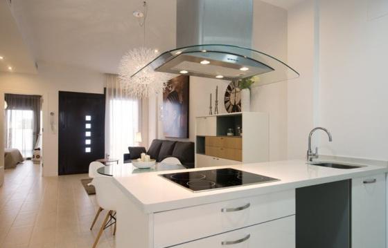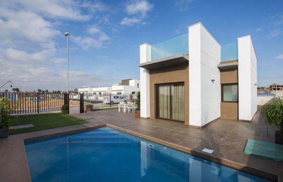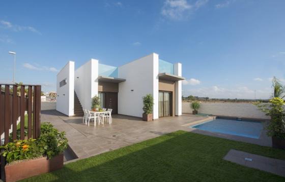 Modern Villa in the area of Ciudad Quesada, Rojales, southern Costa Blanca 3 bedrooms with double beds and wardrobes, 2 bathrooms, lounge with direct access to the garden, kitchen, gallery and Solarium of 67 sqm with panoramic views of the Mediterranean sea. On the site are a garden, a private swimming pool and private Parking. The house is built with quality materials in a modern minimalist style.