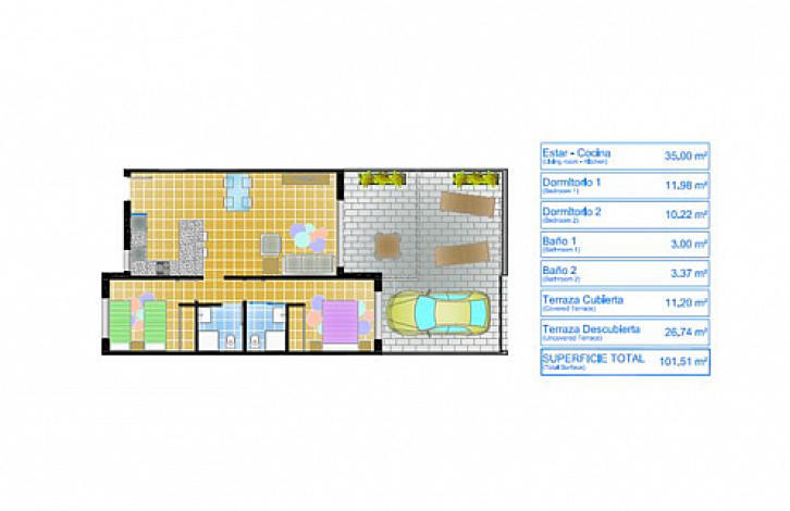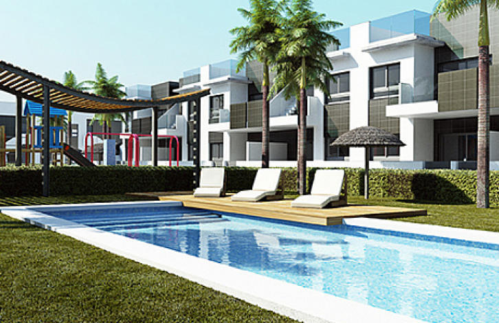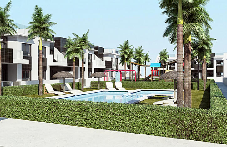 Apartment on the ground floor in Pilar de la Horadada, Costa Blanca. Salon, American kitchen, 2 bedrooms with fitted wardrobes, 2 bathrooms, terrace of 11 m2. The total area of the house is 91 m2. The complex has green areas, 2 communal swimming pools for adults and children.