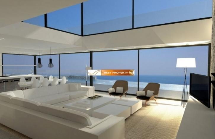 The property is 2016 construction with interior finishes of top quality materials and panoramic windows with an unforgettable view of the Mediterranean Sea. Double glazed windows are installed. The property spreads over several floors. Ground floor: entrance hall, living-dining room with an area of 67 m2 with fireplace, American kitchen - 20 m2, wine bar, billiard room, laundry and pantry, bedroom with private bathroom, guest toilet, a zone with a sauna and a jacuzzi. Upper floor: entrance hall, 3 bedrooms (main one with fireplace) and 2 bathrooms. In the basement there is: a cinema - 52 m2, a garage - 37 m2 and a cleaning plant.
