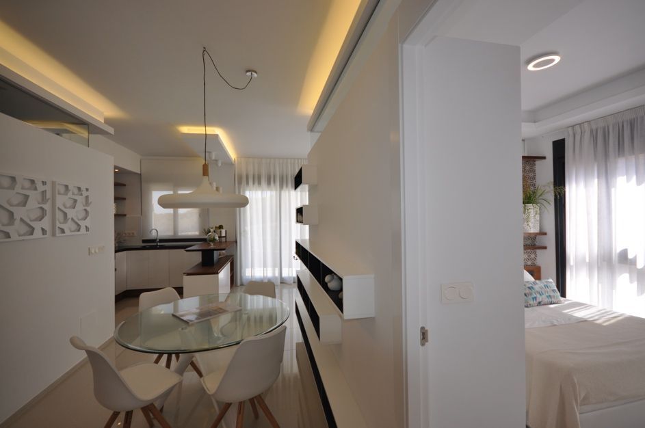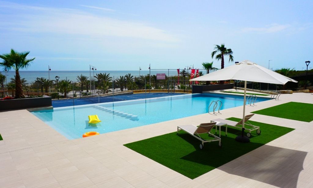 From each terrace you can enjoy a panoramic sea views. In a residential complex apartments 2 or 3 bedrooms 2 or 3 bathrooms, living room, kitchen and a spacious terrace. The house has ecological water heating system, allowing to use a minimal amount of electricity. The kitchen is equipped with furniture, work surface made from modern material with antibacterial coating that is stable to scratches and damage. In the bathrooms heated floors. Great sea view in all apartments. In a residential complex for your convenience there is a big swimming pool, area for sports with gym, landscaped garden, and a storage room and underground Parking. the Arenales del Sol a very beautiful city, located a few kilometers from the capital of the province of Alicante. The town is small, but fully developed infrastructure, convenient location, stunning scenery and miles of sandy beach. Alicante airport is only 10 minutes. 2 bedrooms area 66 – 82 sq. m. The price is 195. 000-279. 000 €