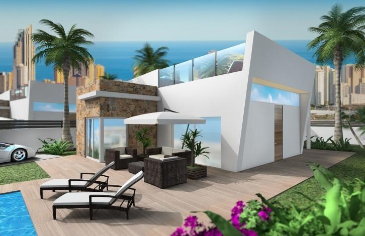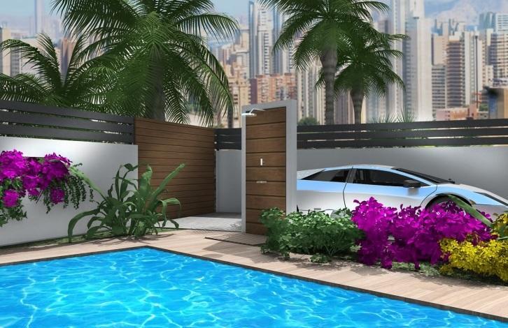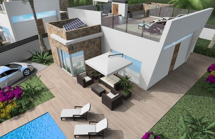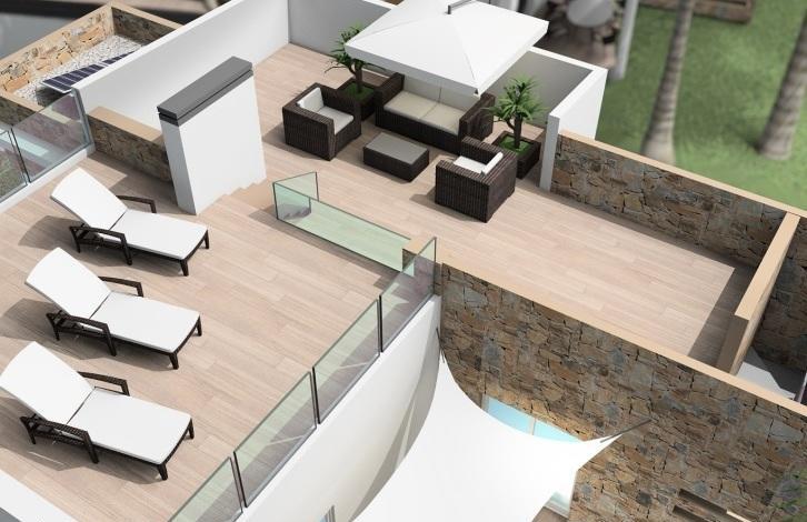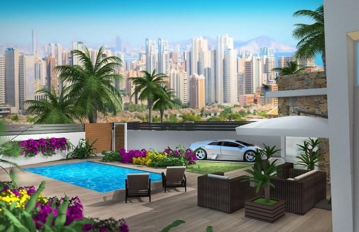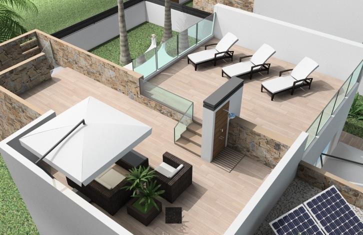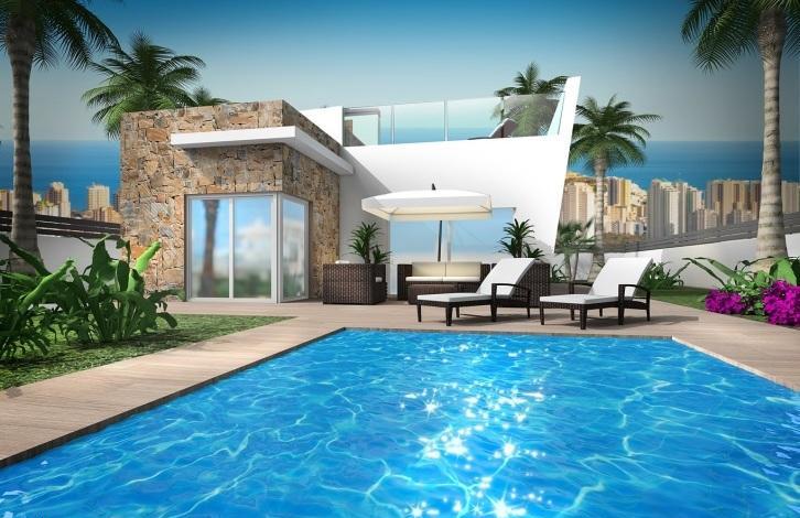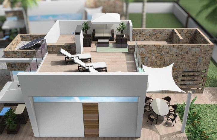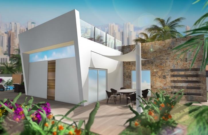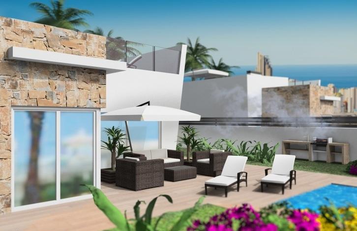 Вилла в Финестрате. Салон, кухня, 3 спальни с двуспальными кроватями и встроенными шкафами, 2 ванные комнаты, терраса, солярий 76 м2. Общая площадь дома 91 м2. На участке в 535 м2 есть сад с деревьями, частный бассейн, зона барбекю и гараж.