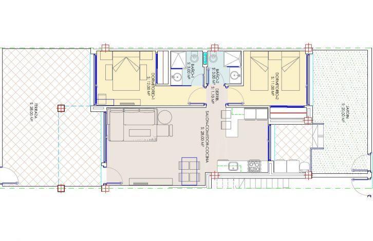 Bungalow on the ground floor in Los Balcones, Torrevieja. Salon, open semi-equipped kitchen, 2 bedrooms, 2 bathrooms, terrace and private garden of 20 m2. The total area is 83 m2. On the territory there are 2 communal swimming pools for adults and children, a green area. The complex is equipped with underground parking and storage for each object.