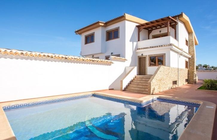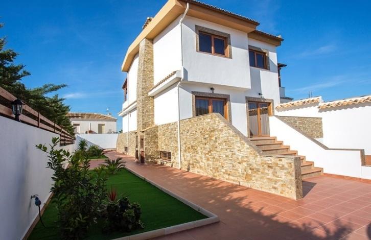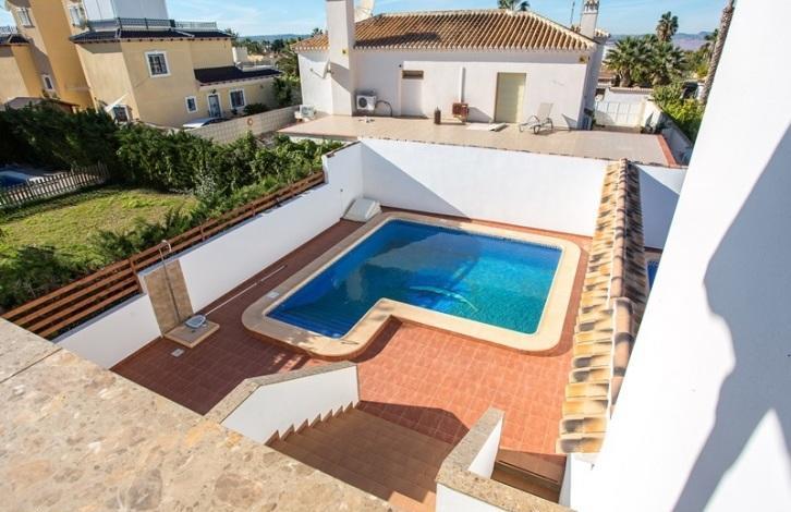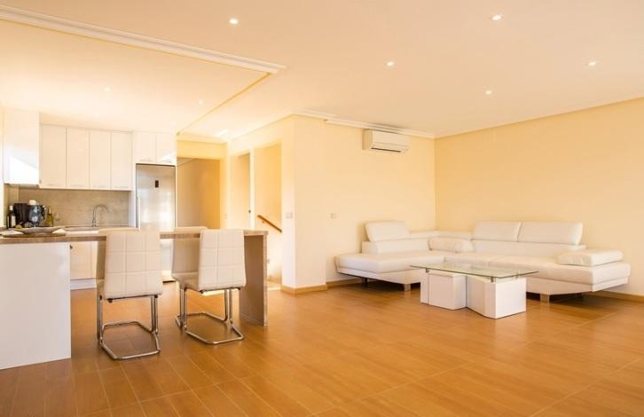 Вилла-таунхаус в урбанизации Торрета Флорида в городе Торревьеха. Новый дом, три этажа, с бассейном на участке, подземный гараж для нескольких автомобилей.