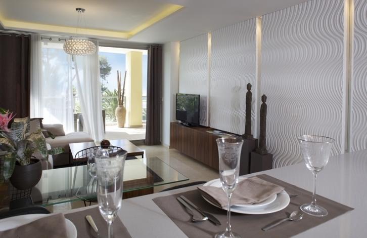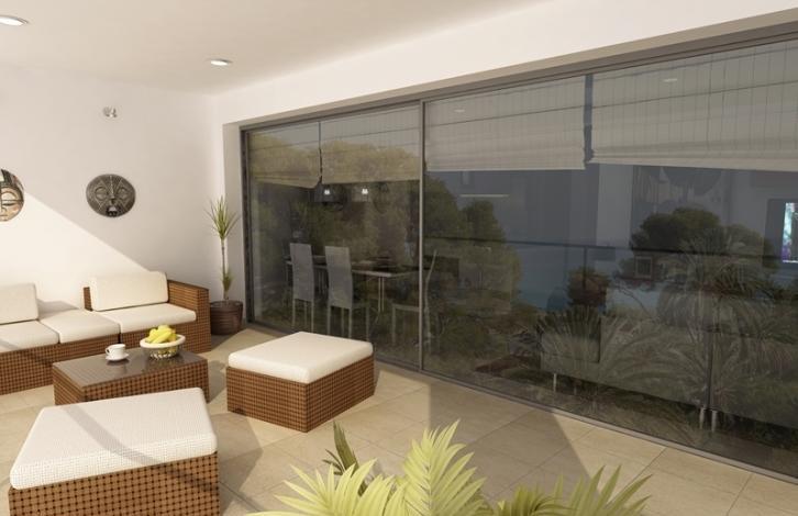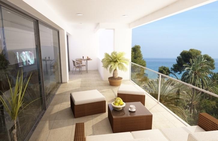 Apartment with stunning panoramic views of the first line of the sea in Villajoyosa. Salon, 2 bedrooms, 2 bathrooms, semi-open kitchen, terrace 21 sq. M. m. High quality materials. The apartment is located in a complex with a communal swimming pool, underground parking and tropical vegetation.