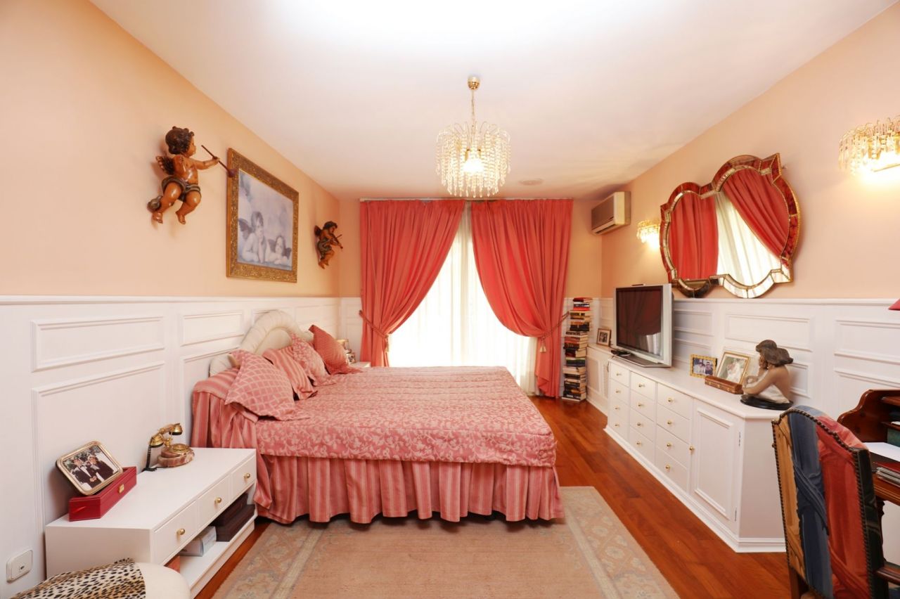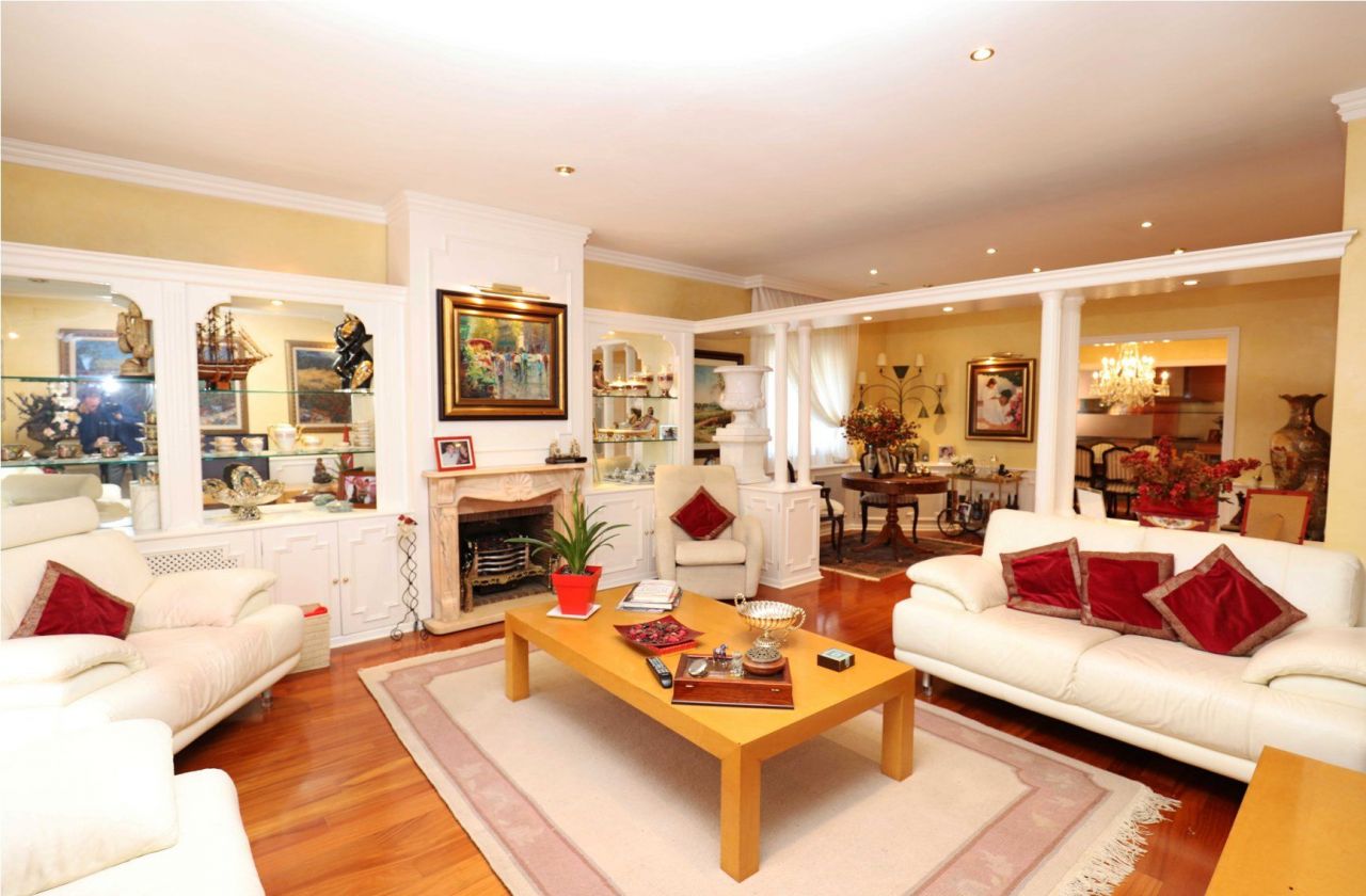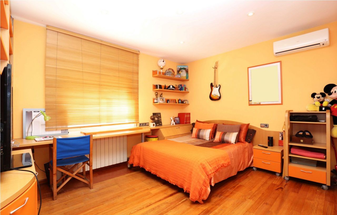 The first floor at the street level consists of a living room of 35 m2 with a fireplace and an exit to the garden, a dining room, a kitchen with a dining area and an exit to the terrace, a guest toilet, a double bedroom, and a hall from where there is an access to all the floors.