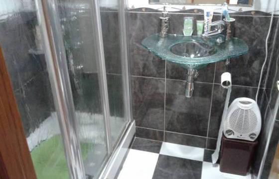 Tiled floor, wooden doors and aluminum windows.