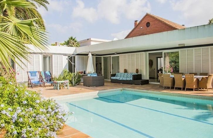 This magnificent Villa is located in Terramar, in Sitges town, that was built in 1956 by the architect Coderch and renovated in 1998. One-storey house of 400 m2 has three \"wings\" and situated near the sea and Golf course. From anywhere in the home and access to a huge pool (7x13) with night illumination. The house features a living-dining room with fireplace, reading room, study, kitchen, 6 bedrooms (3 of them are suites with EN-Suite), 5 bathrooms, maids room with EN Suite shower, Laundry room, storage room, garden and garage. The house has heating, marble floors and parquet in the bedrooms.