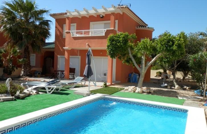 The plot of 600 m2 is located opposite the golf courses, the house of 140 m2 has 2 bedrooms, 2 bathrooms, separate kitchen, terrace, patio, parking, swimming pool, pantry, air conditioning, furniture. Price 170. 000 €.