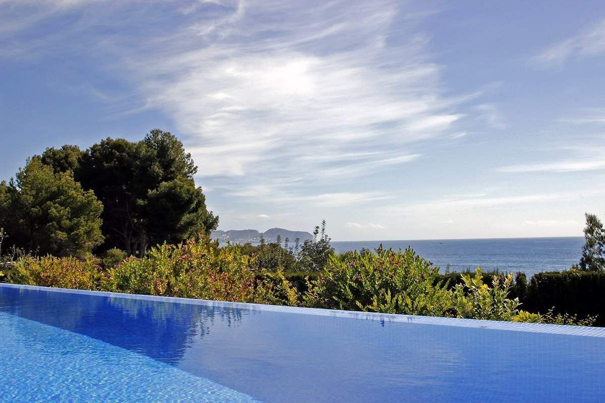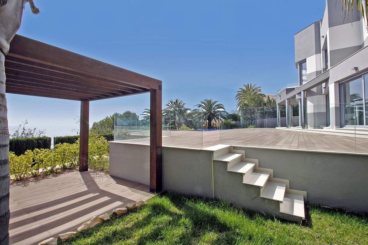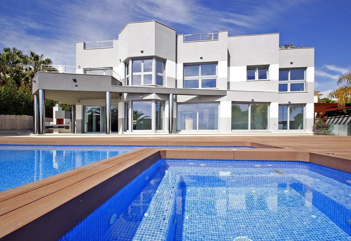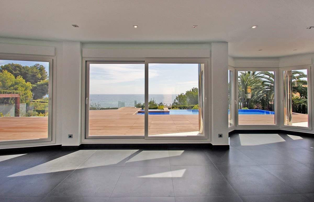 Brand new luxury villa for sale in Calpe, in urbanization Calalga. This luxury villa of contemporary design is located on a first line plot with direct sea access. This exclusive plot has an area of 1. 300 m2 and the villa has a floor area of 520 m2 on 2 floors + basement (spa), as follows: 5 bedrooms, 6 bathrooms (5 en-suite) + 1 guest toilet, fully fitted kitchen, dining room and large living room + nice porch (covered terrace). Enjoy large outdoor terraces, (+200 m2), where we have an impressive pool with endless effect (+ integrated Jacuzzi area) and a nice barbecue. This villa was built in year 2014 and stands out for its design, finishes and quality materials and for its impeccable execution of work. It is equipped with underfloor heating system and central ducted air-conditioning. In the basement we have a spa area with a heated indoor pool (8 x 3,5 meters), gym, bathroom, cinema room and wine cellar. The garden is beautiful and low maintenance (automatic irrigation system). It also has ample parking areas with a double pergola. Undoubtedly we are facing one of the most exclusive villas on the Costa Blanca.